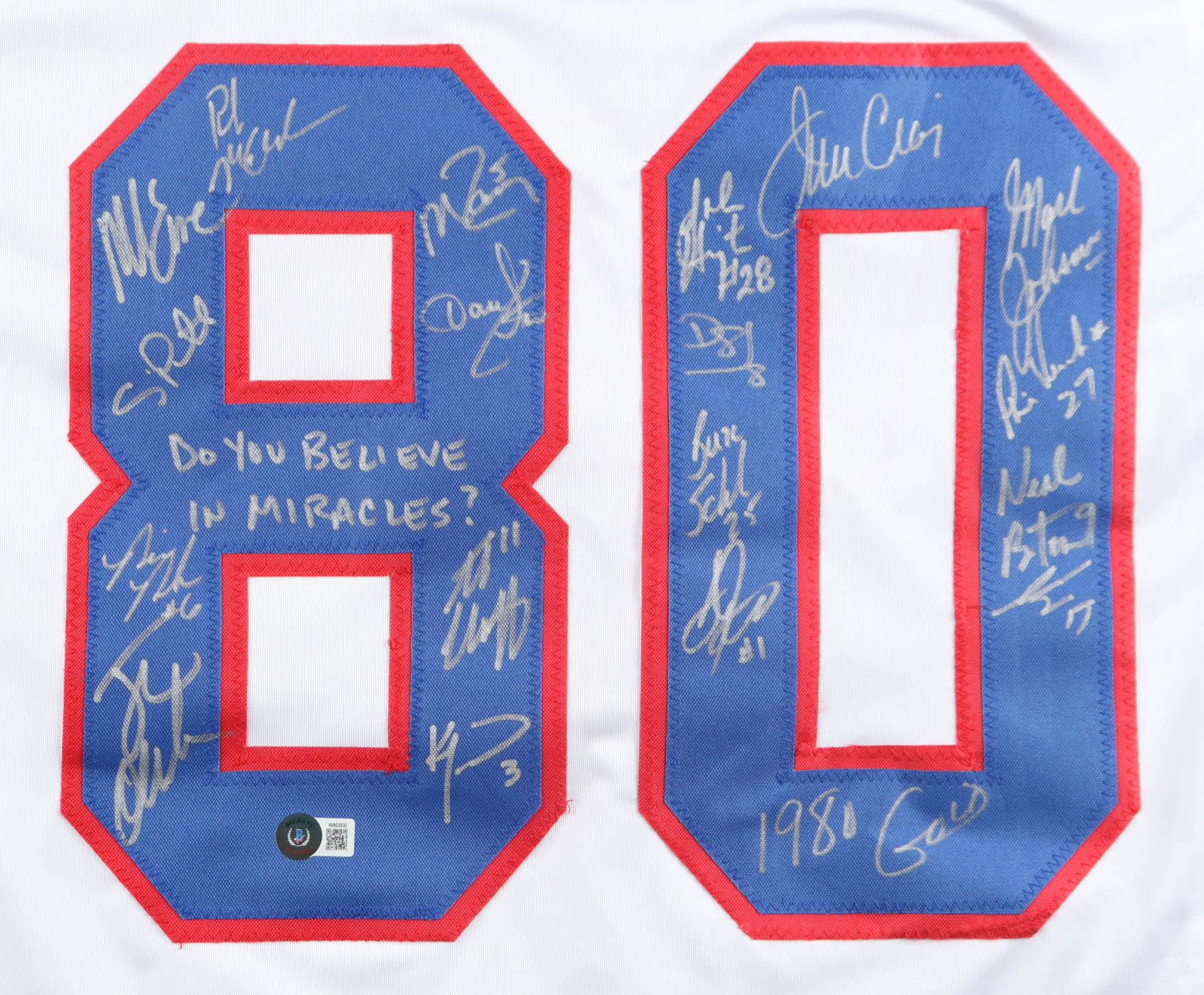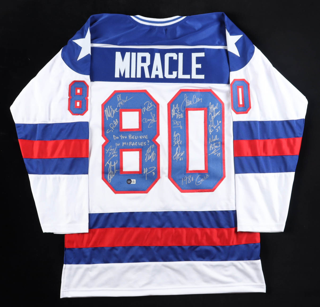 1980 Team USA | "Miracle on Ice" | Jersey Signed by (18) with Mike Eruzione, Jim Craig, Mark Johnson, Neal Broten Inscribed "Do you Believe in Miracles?" & "1980 Gold" (Beckett)