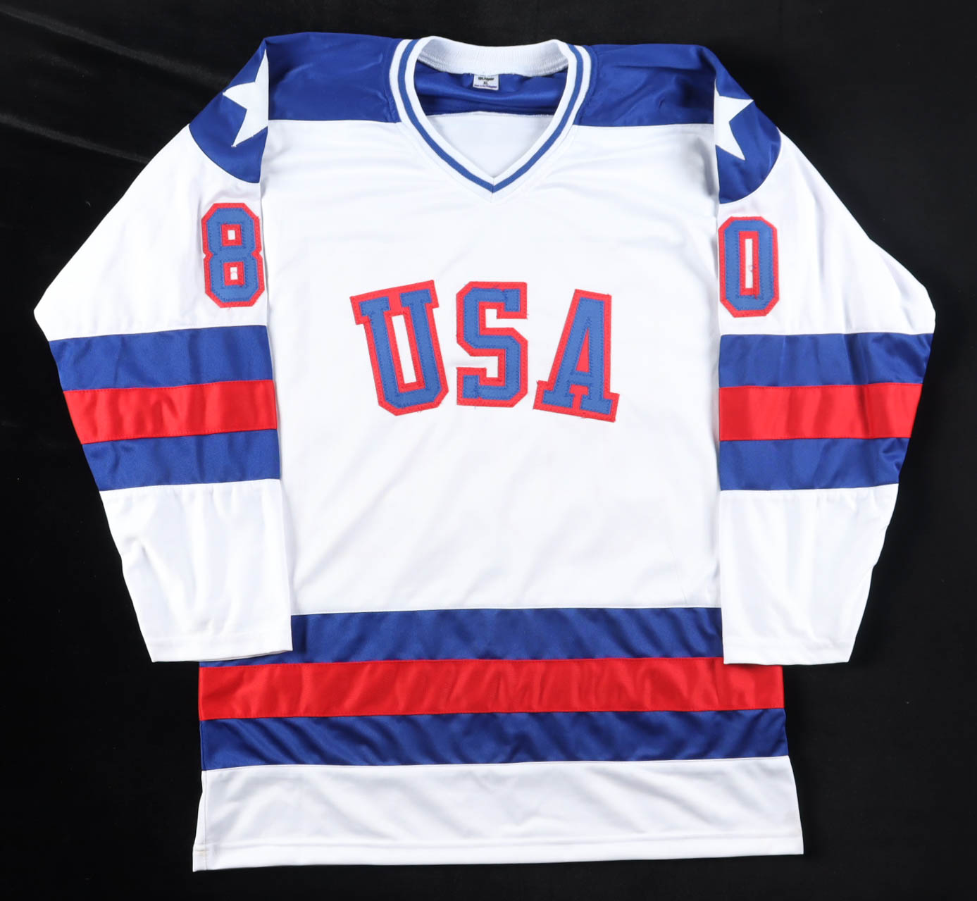 Custom jersey with everything sewn on, size XL. Hand-signed & inscribed by (18) with Rob McClanahan, Bill Baker, Neal Broten, Dave Christian, Steve Christoff, Mike Eruzione, Steve Janaszak, Mark Johnson, Ken Morrow, Dave Silk, John O'Callahan, Mike Ramsey, William "Buzz" Schneider, Eric Strobel, Phil Verchota, Craig Patrick, John Harrington, and Jim Craig. Please note, there is staining on the front of the jersey. See photos regarding the condition of the item.