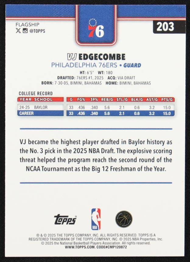 VJ Edgecombe 2025-26 Topps Holo Foil #203 RC