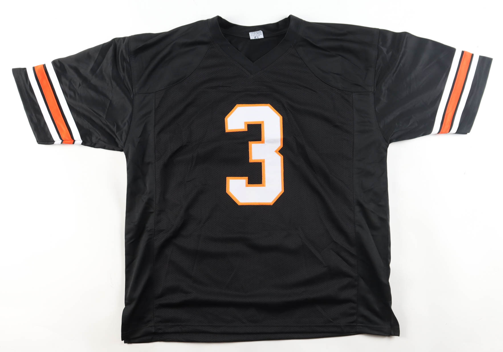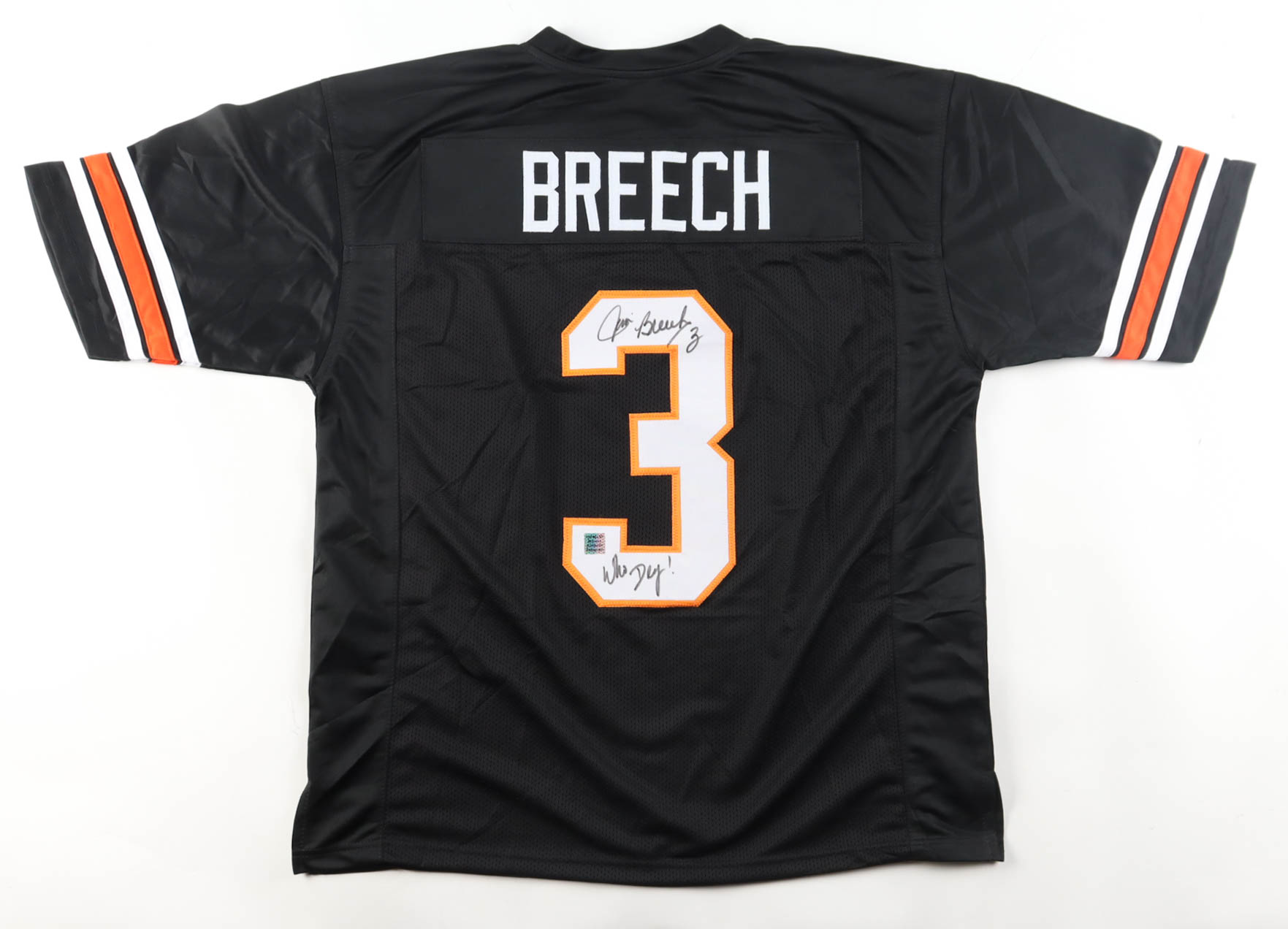 Custom jersey. Everything is sewn on, size XL. Hand-signed and inscribed by Jim Breech. Please note, glue is visible through the reverse number.