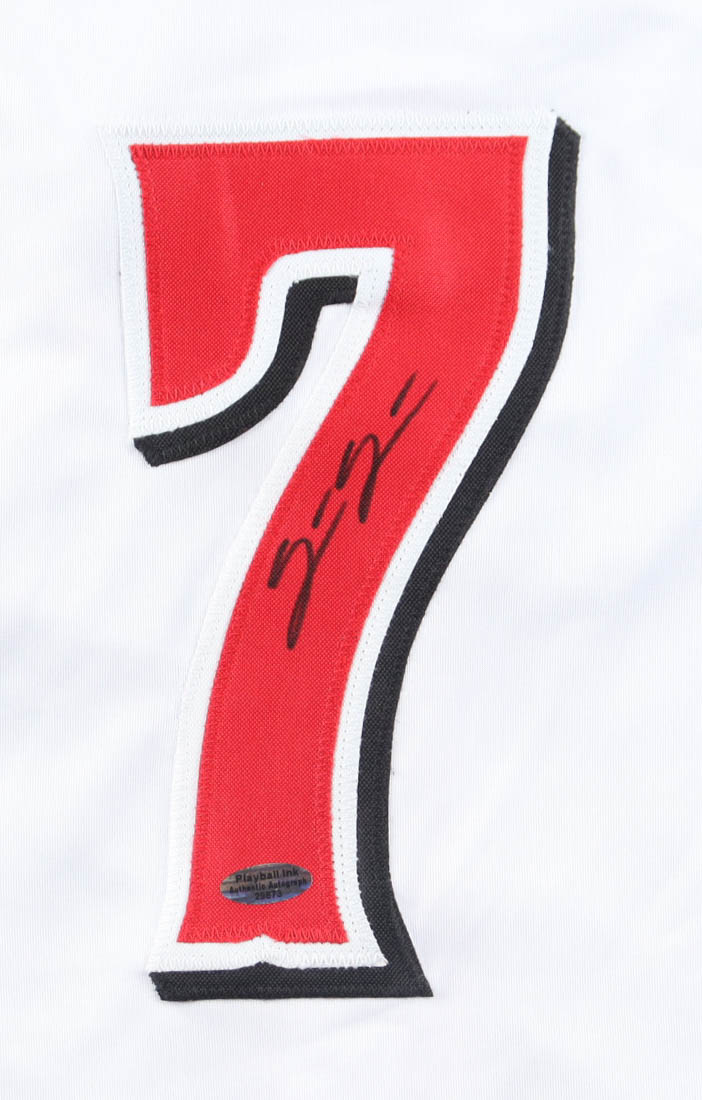 Custom jersey. Everything sewn on, size XL. Hand-signed by Spencer Steer.