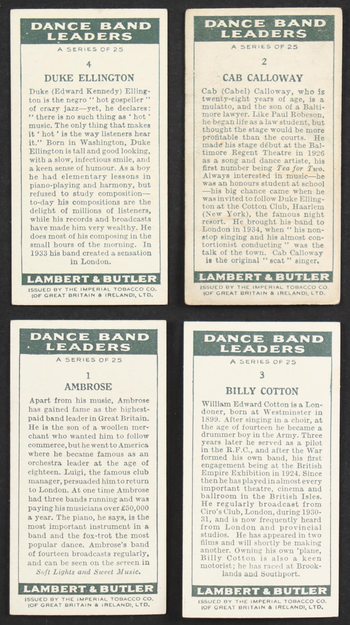 Includes Duke Ellington #4, Cab Calloway #2, Ambrose #1, Billy Cotton #3 | Vintage Tobacco Card Set