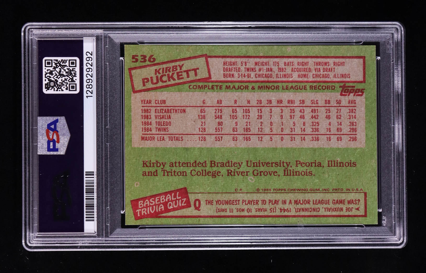 Kirby Puckett 1985 Topps #536 RC (PSA 8)