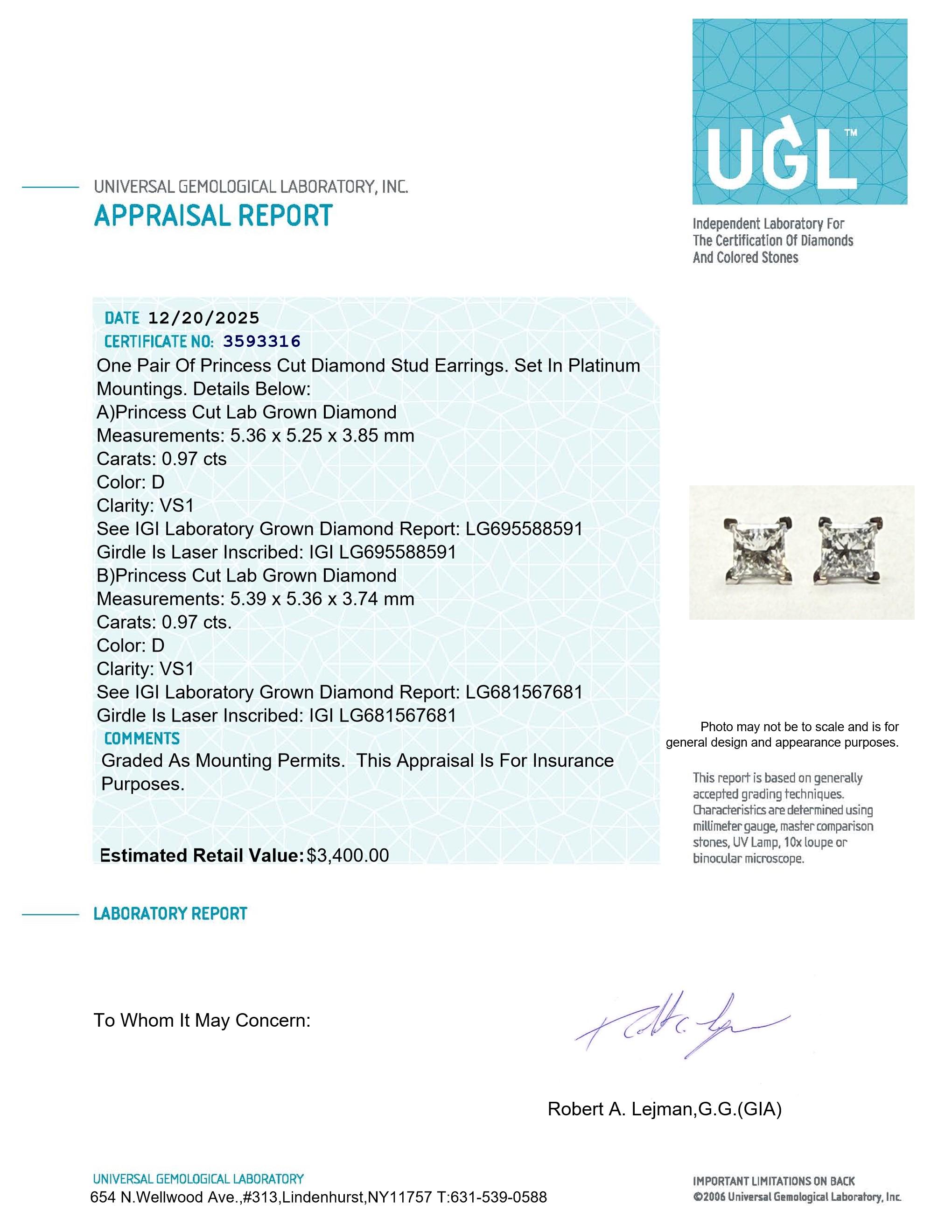 Platinum 1.94 Carats Lab Grown Diamond Stud Earrings D, VS1 | $3,400 Estimated Retail Value (UGL & IGI Certs) | Brand New
