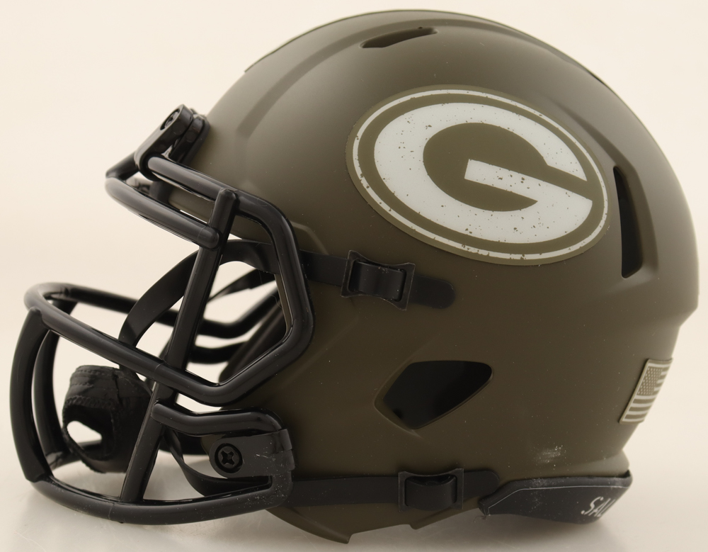 Riddell Green Bay Packers Salute To Service Alternate Speed mini helmet. Hand-signed by Jordan Love.