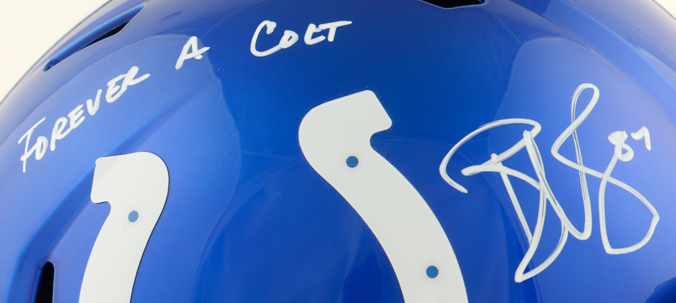 Riddell Indianapolis Colts full-size replica Flash Alternate Speed helmet. Hand-signed and inscribed by Reggie Wayne.