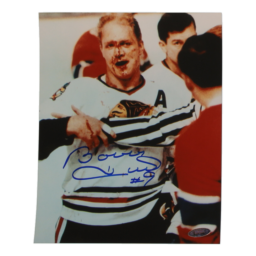 Photo measures 8" x 10" in size and has been hand-signed by Bobby Hull (D. 2023, Chicago Blackhawks, HOF).