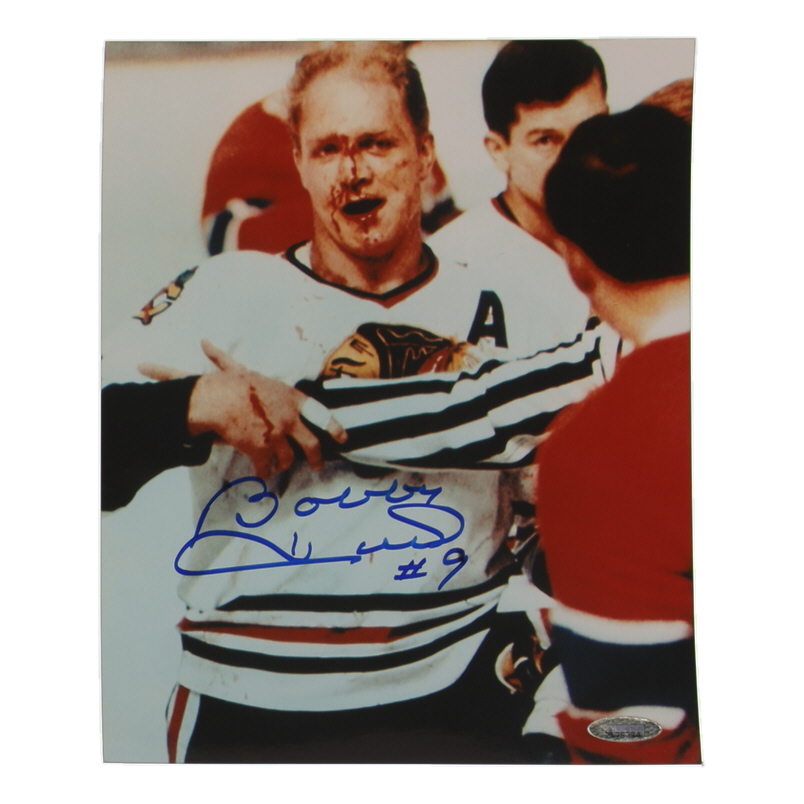 Photo measures 8" x 10" in size and has been hand-signed by Bobby Hull (D. 2023, Chicago Blackhawks, HOF).