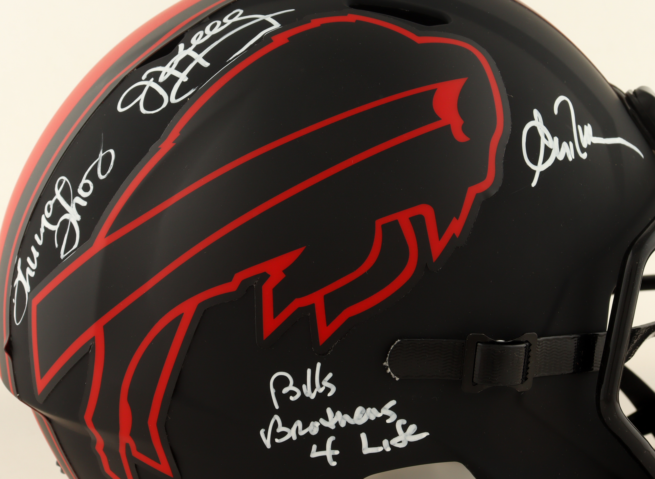 Jim Kelly, Thurman Thomas & Andre Reed Signed Bills Full-Size Eclipse Alternate Speed Helmet Inscribed "Bills Brothers 4 Life" (JSA)