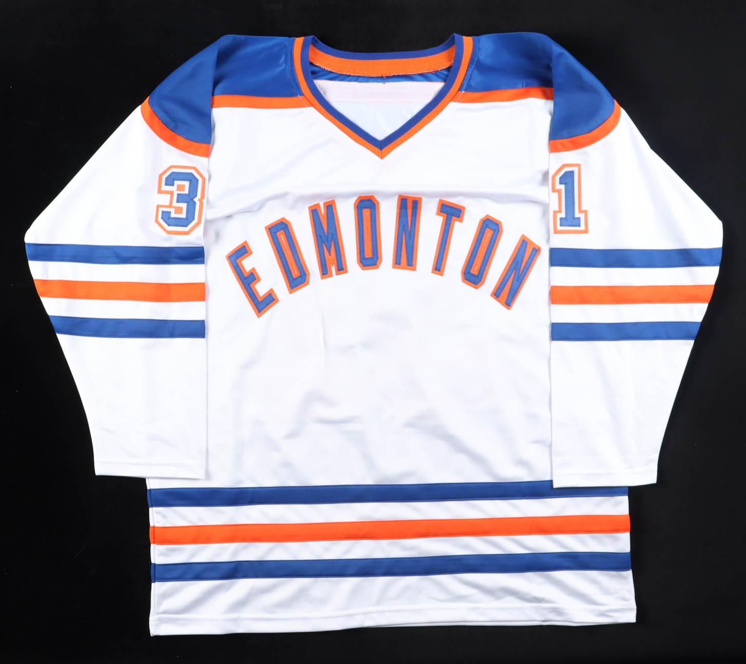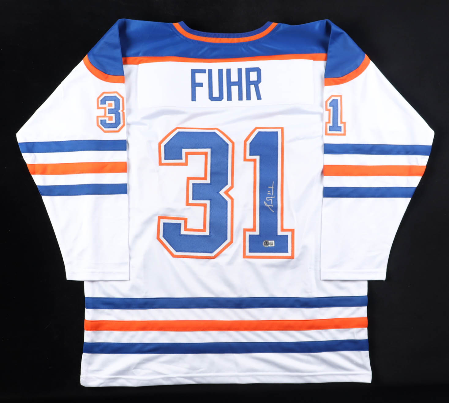 Custom jersey with everything sewn on, size XL. Hand-signed by Grant Fuhr (HOF).