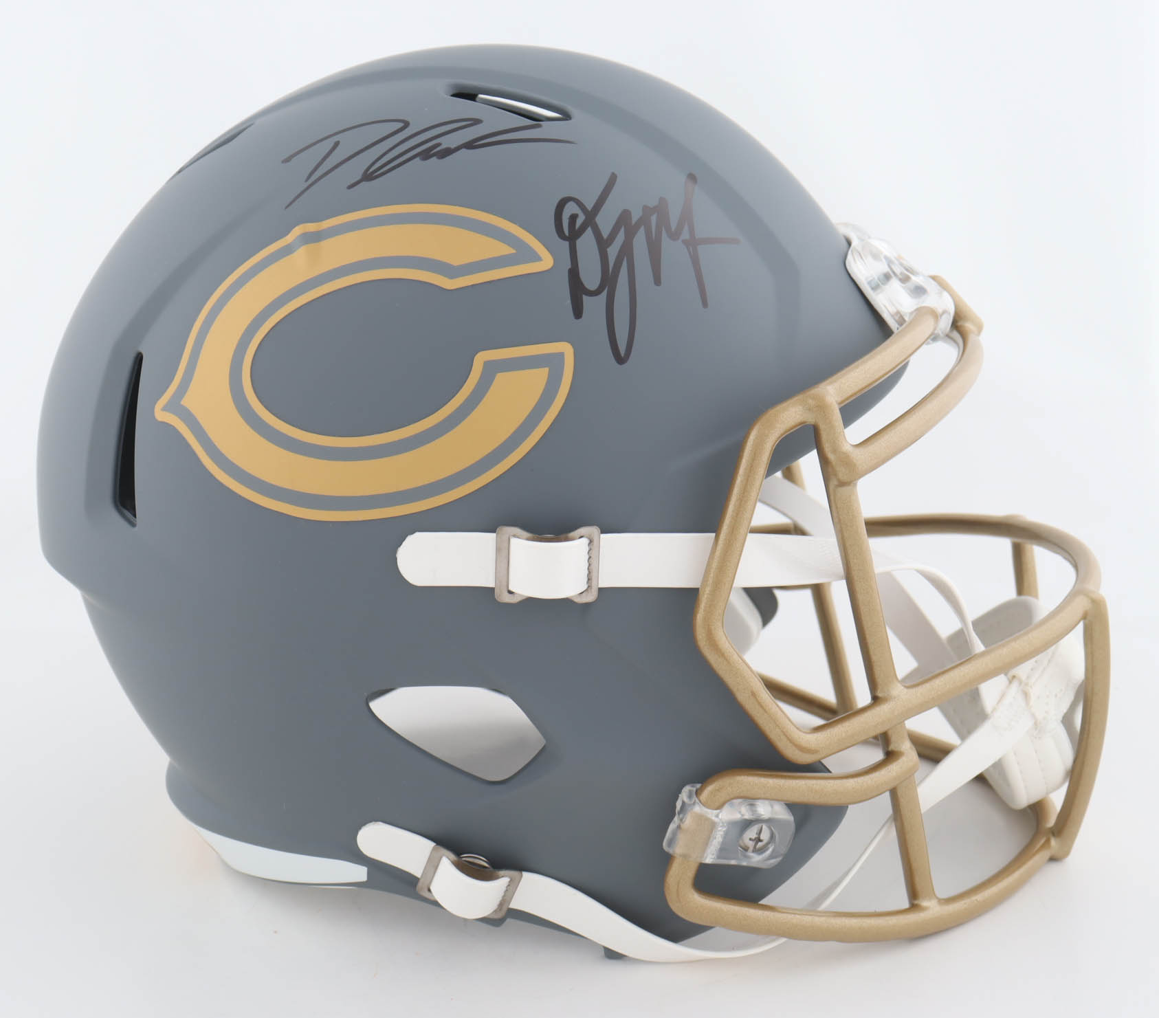 Riddell Chicago Bears full-size replica Slate Alternate Speed helmet. Hand-signed by D'Andre Swift and DJ Moore.