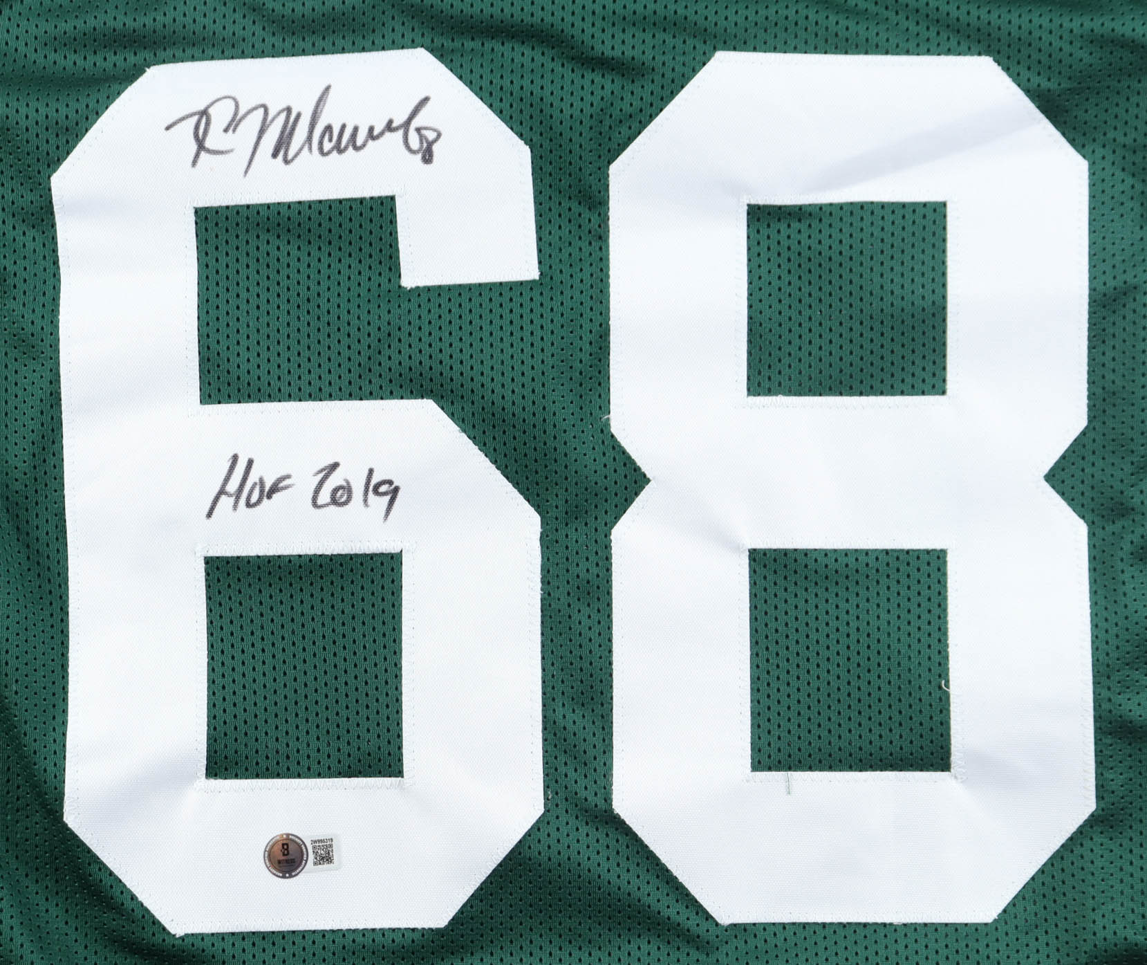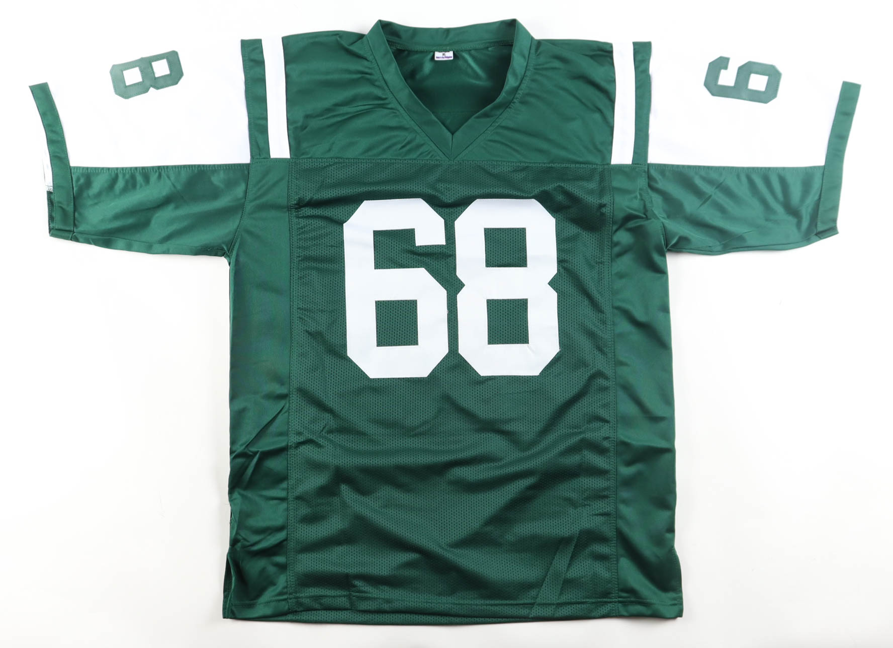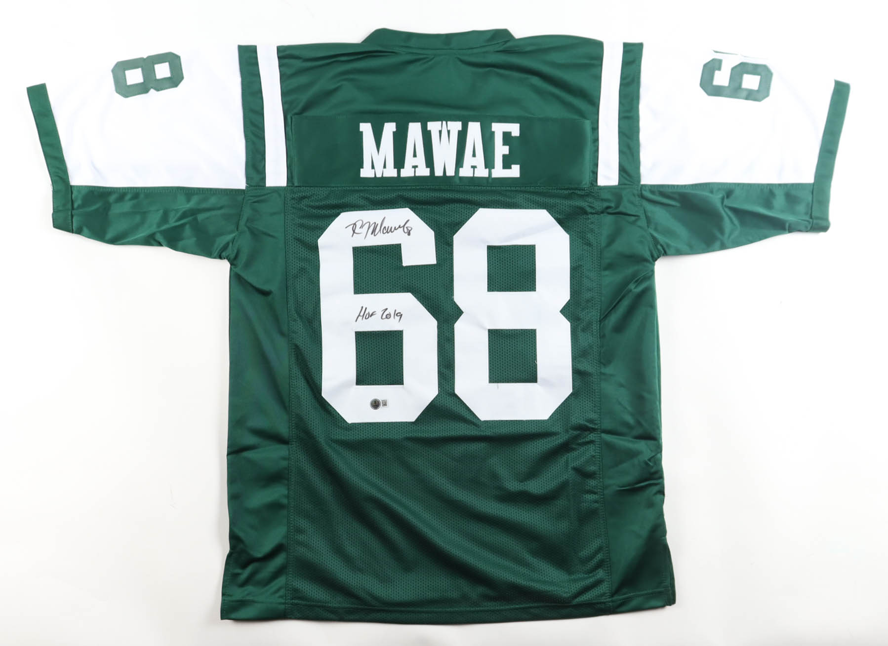 Custom jersey with everything sewn on, size XL. Hand-signed and inscribed by Kevin Mawae (New York Jets, HOF).