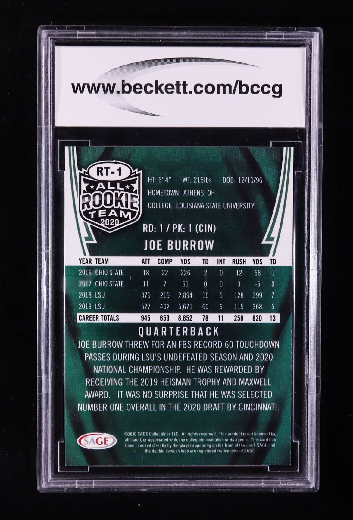 Joe Burrow 2020 Sage All Rookie Team #RT-1 RC (BCCG 10)