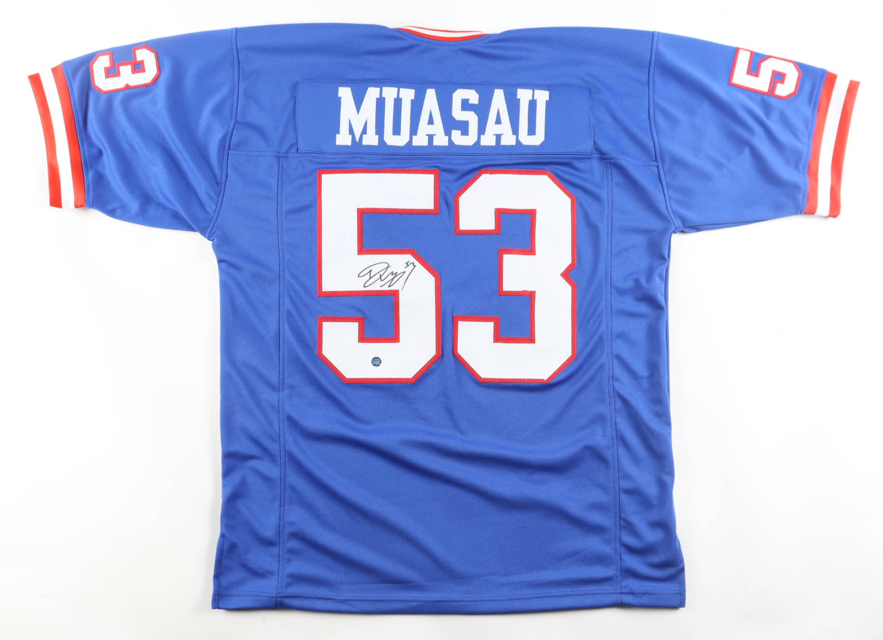 Custom jersey with everything sewn on, size XL. Hand-signed by Darius Muasau.