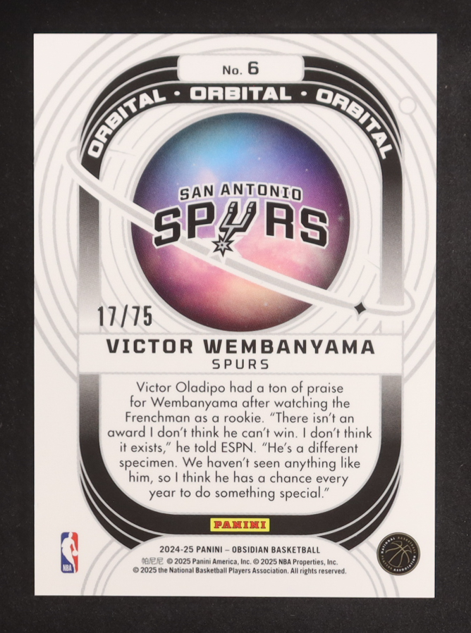 Victor Wembanyama 2024-25 Panini Obsidian Orbital Electric Etch Purple Flood #6 #17/75