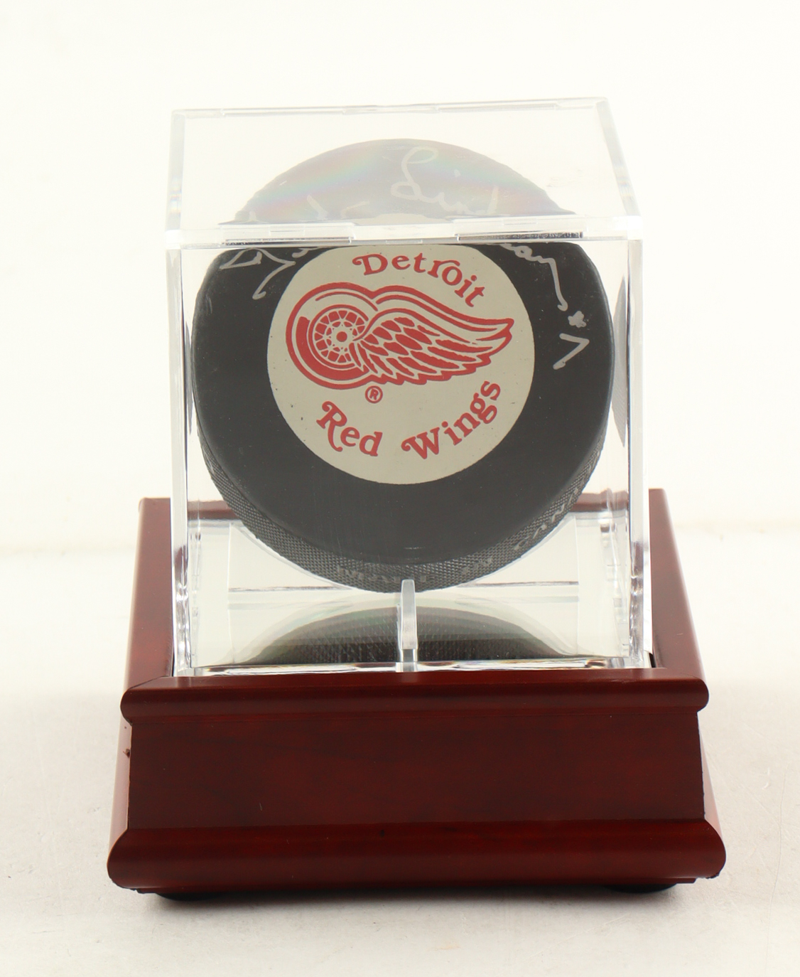 Ted Lindsey Signed Red Wings Logo Puck In Display Case (PSA)
