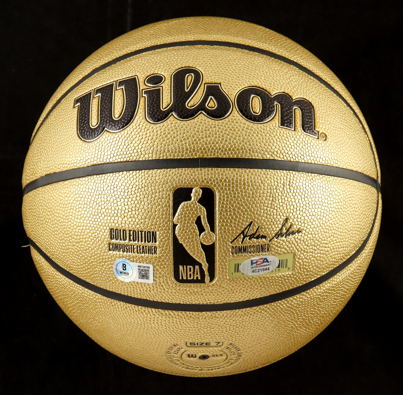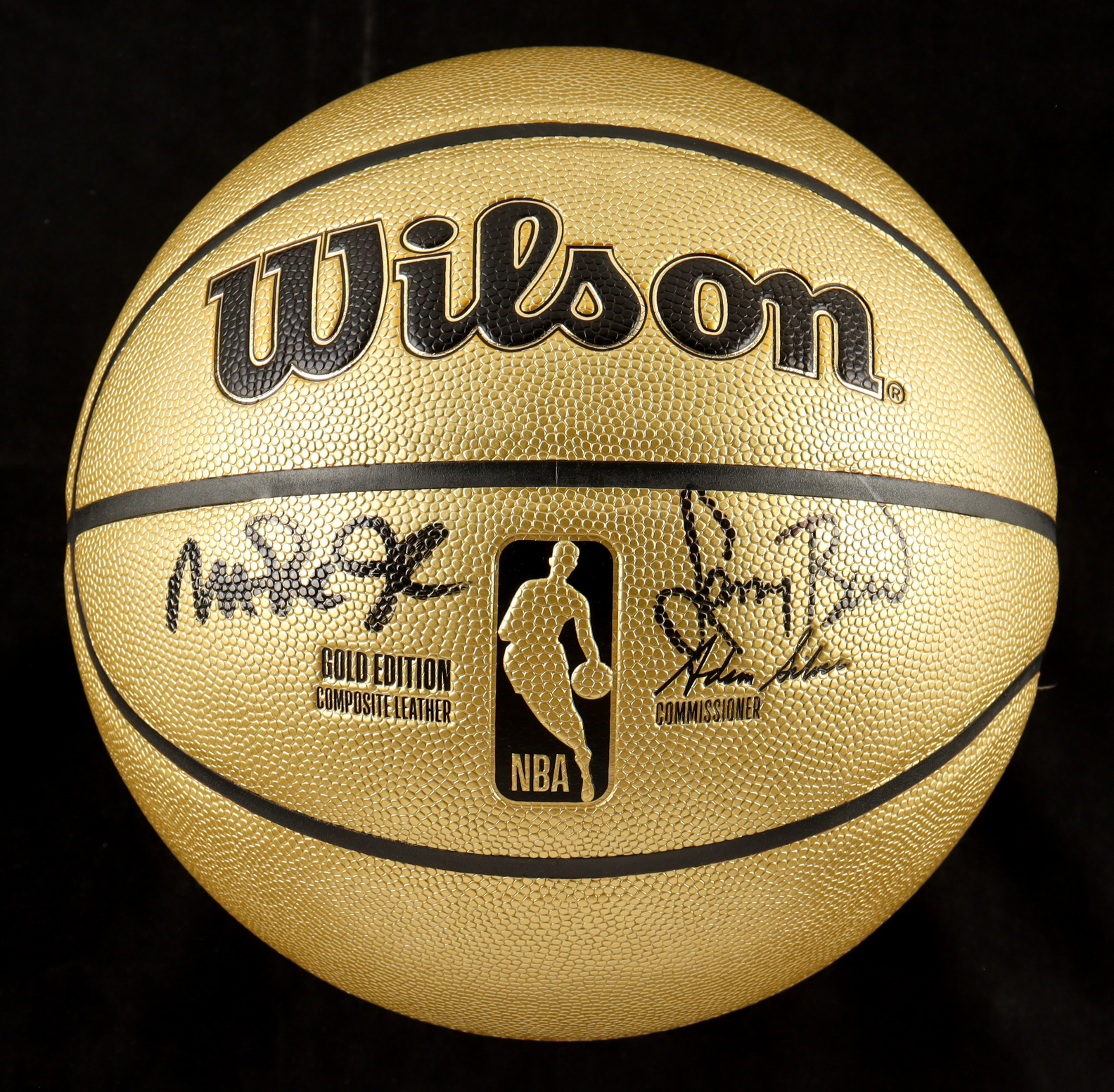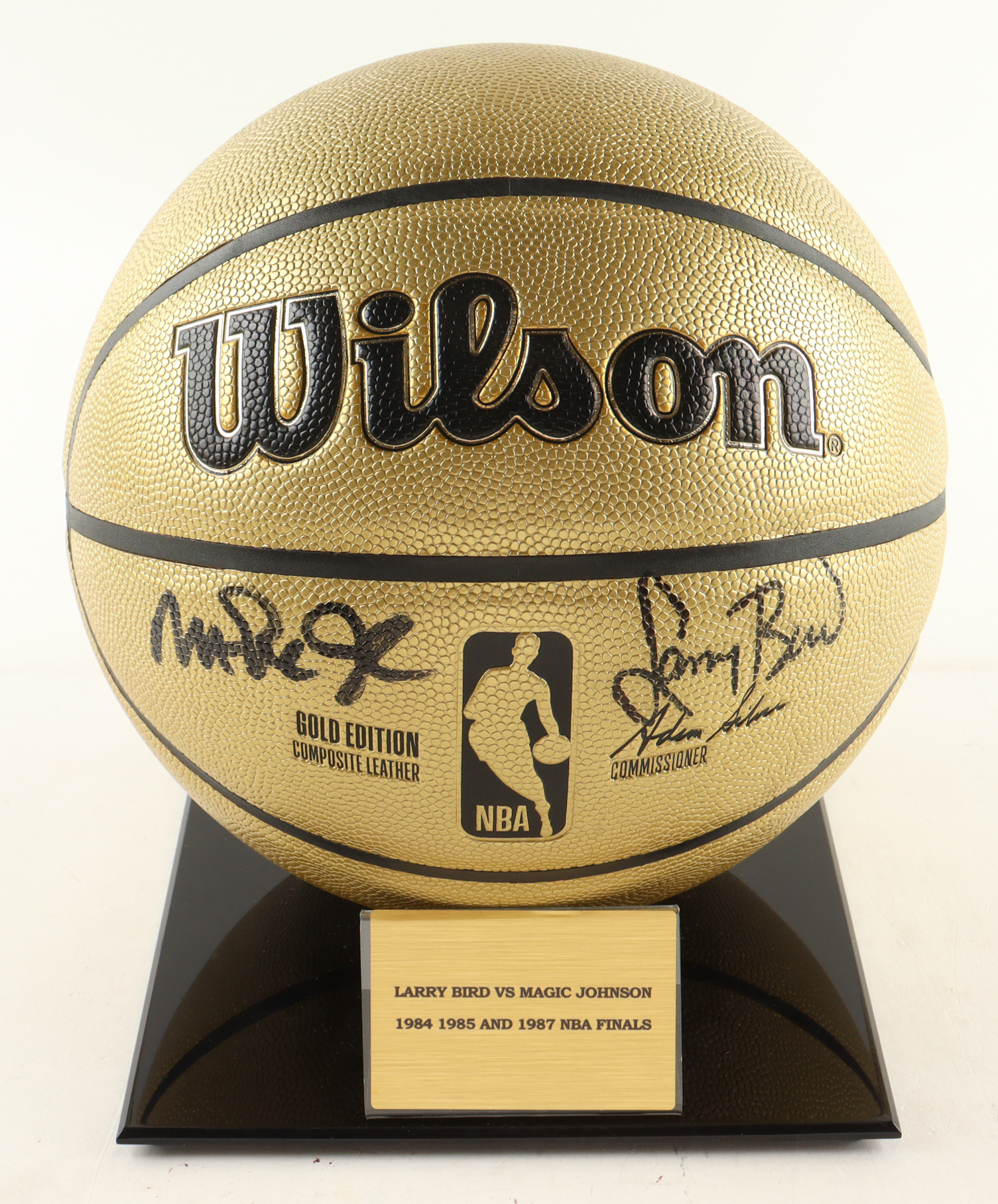 Wilson Gold Edition NBA Basketball. Hand-signed by Magic Johnson (Los Angeles Lakers, HOF) and Larry Bird (Boston Celtics, HOF). The display stand is included as shown.