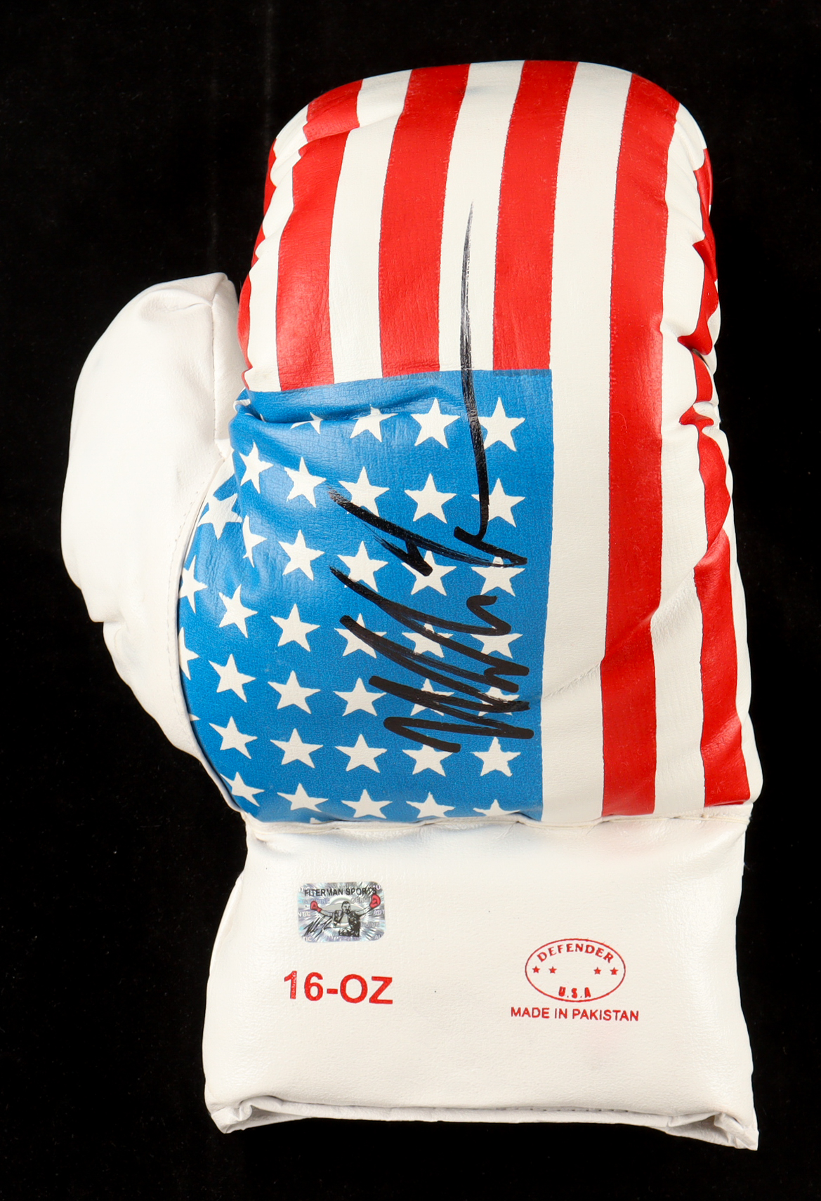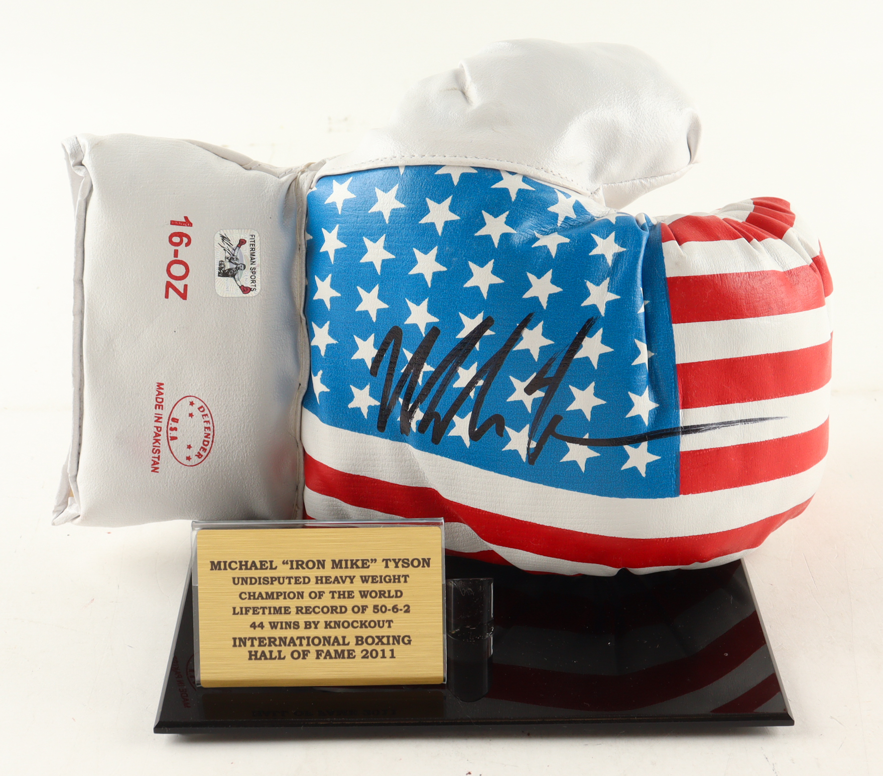 USA Boxing Glove has been hand-signed by Mike Tyson (HOF). The display stand and Tyson full career statistics plaque is included as shown.