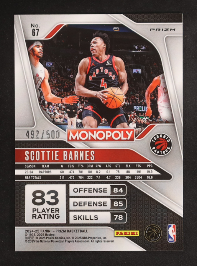 Scottie Barnes 2024-25 Panini Prizm Monopoly Gold Millionaire Shimmer #67 #492/500
