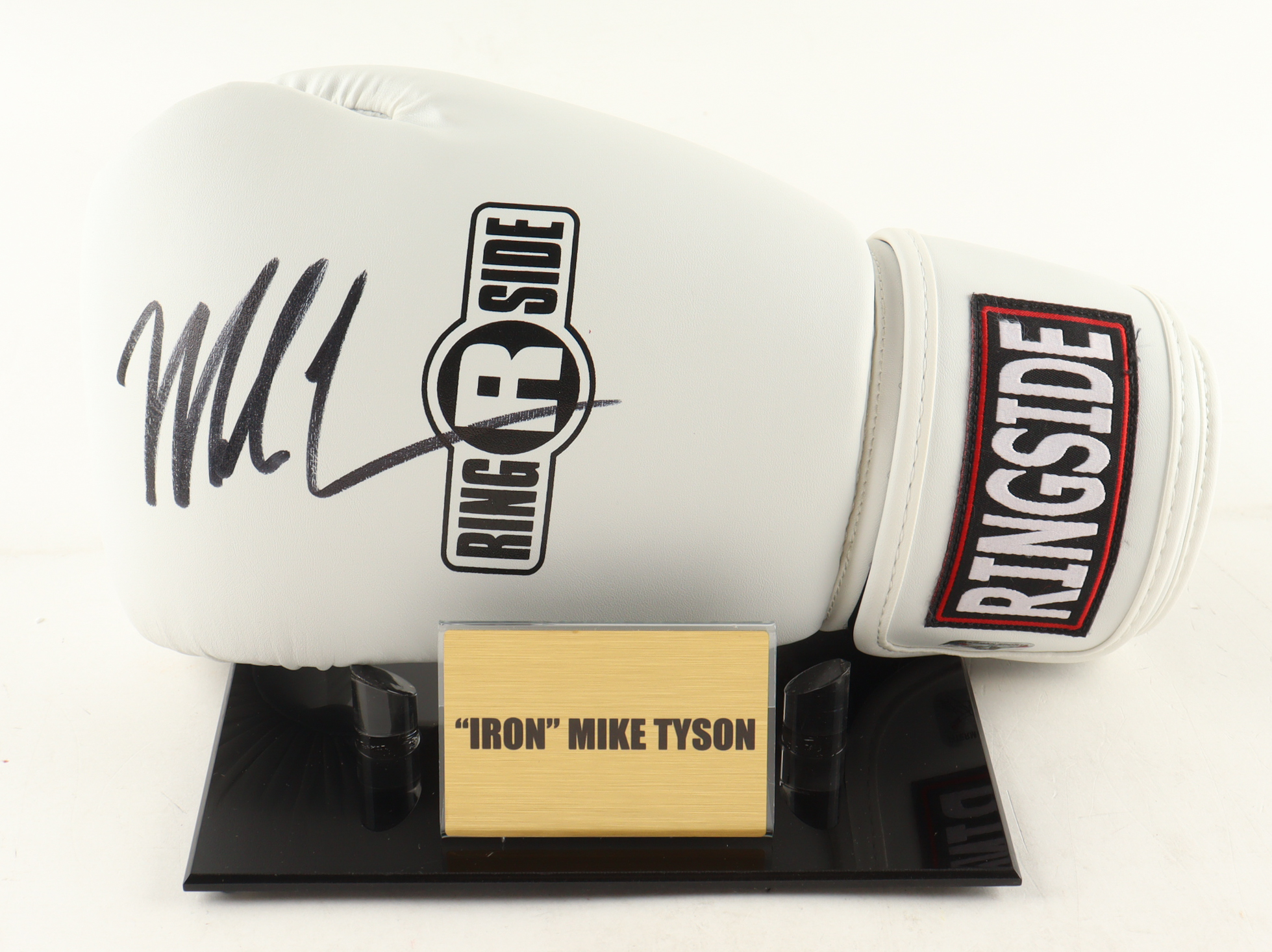 Ringside Boxing Glove has been hand-signed by Mike Tyson (HOF). The display stand and Iron Mike title plaque is included as shown.
