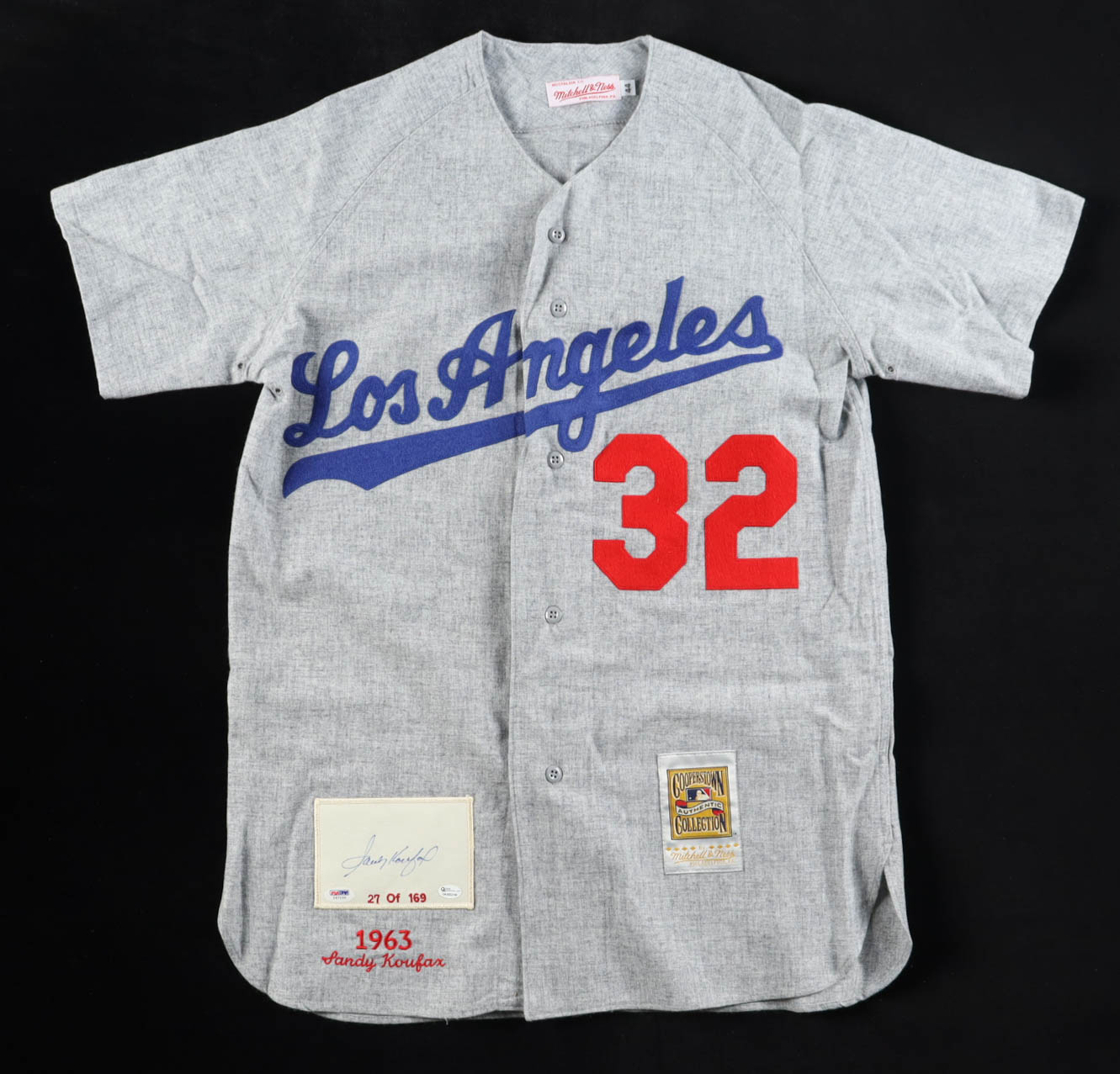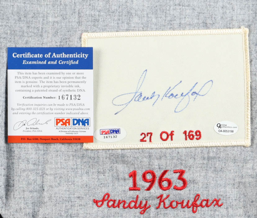 Mitchell & Ness Cooperstown Collection authentic jersey with everything sewn on, size 44. Hand-signed by Sandy Koufax (Los Angeles Dodgers, HOF). The jersey is limited edition and is #27 of 169.