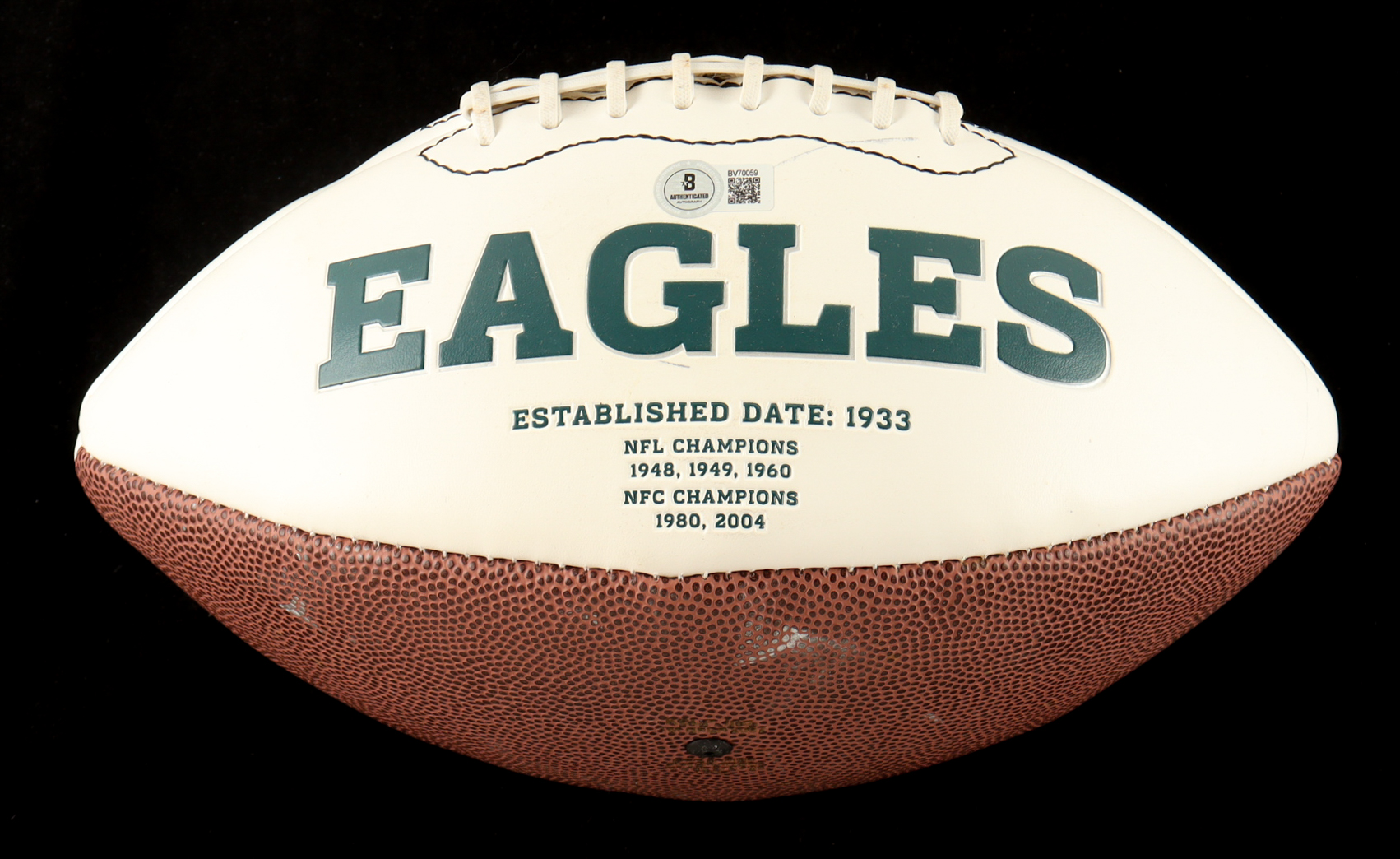 Philadelphia Eagles White Panel Logo Football has been hand-signed by Harold Carmichael. Please note there are stray pen marks and scuffs all around the football, see photos for more details.