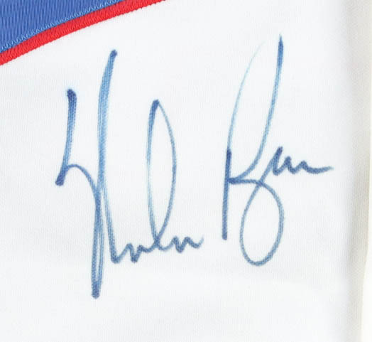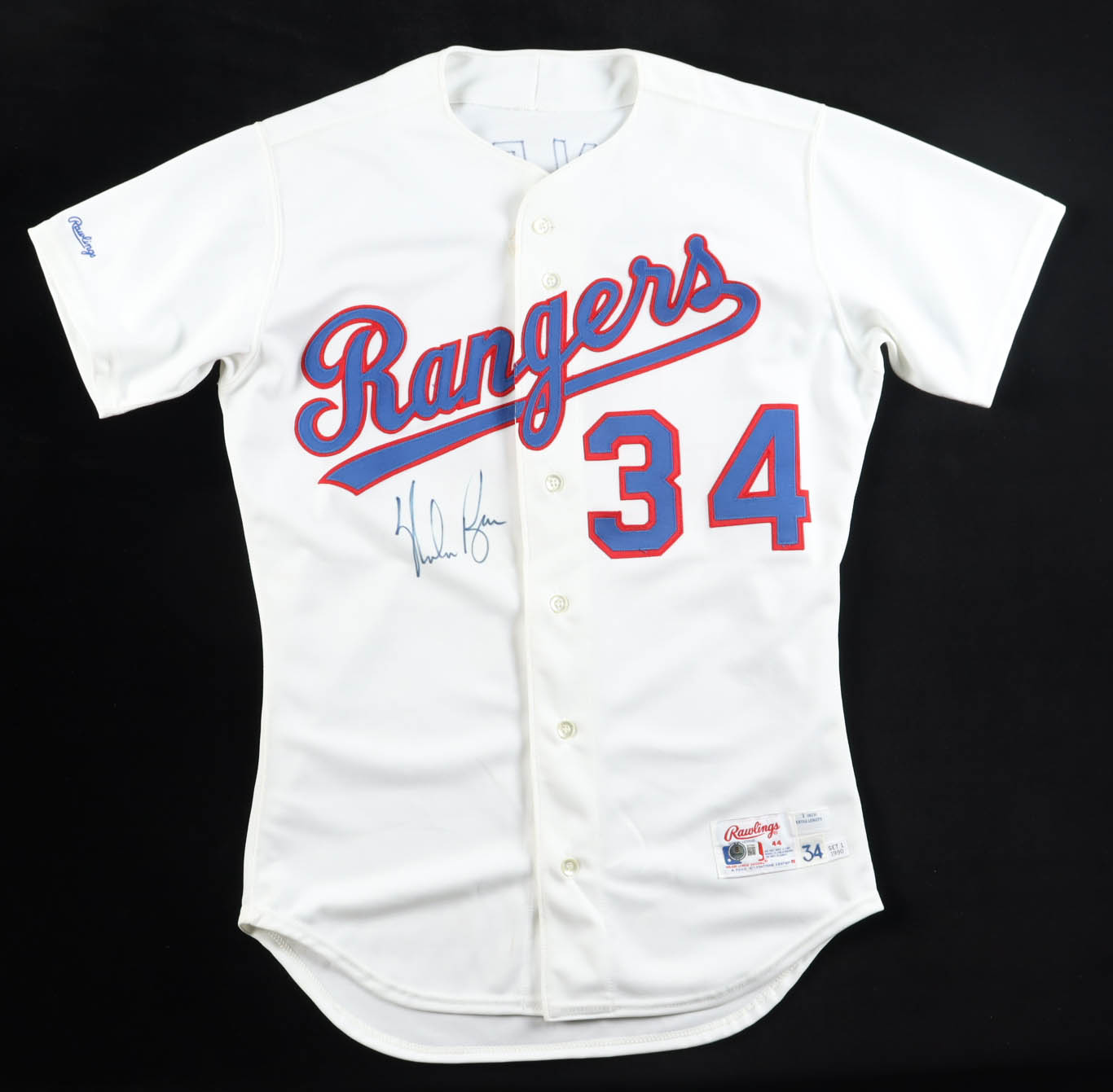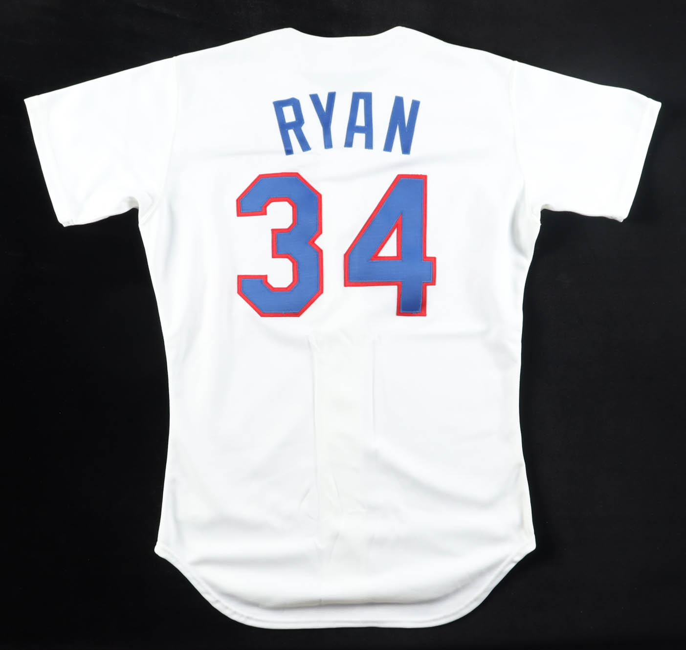 Rawlings jersey with everything sewn on, size 44. Hand-signed by Nolan Ryan (Texas Rangers, HOF).