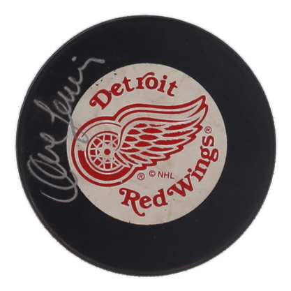 Detroit Red Wings logo hockey puck. Hand-signed by Dave Lewis.