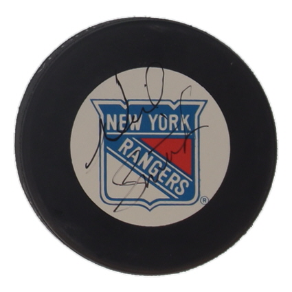 New York Rangers logo hockey puck. Hand-signed by Neil Smith.
