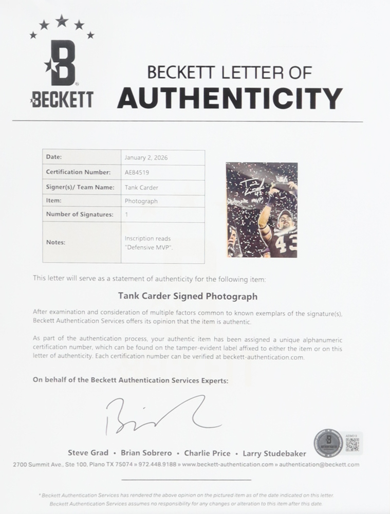 Custom frame measures 16" x 18" in size. Features a photo that has been hand-signed and inscribed by Tank Carder