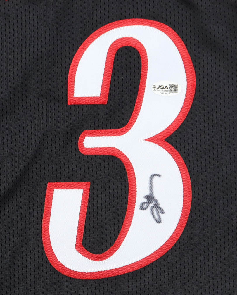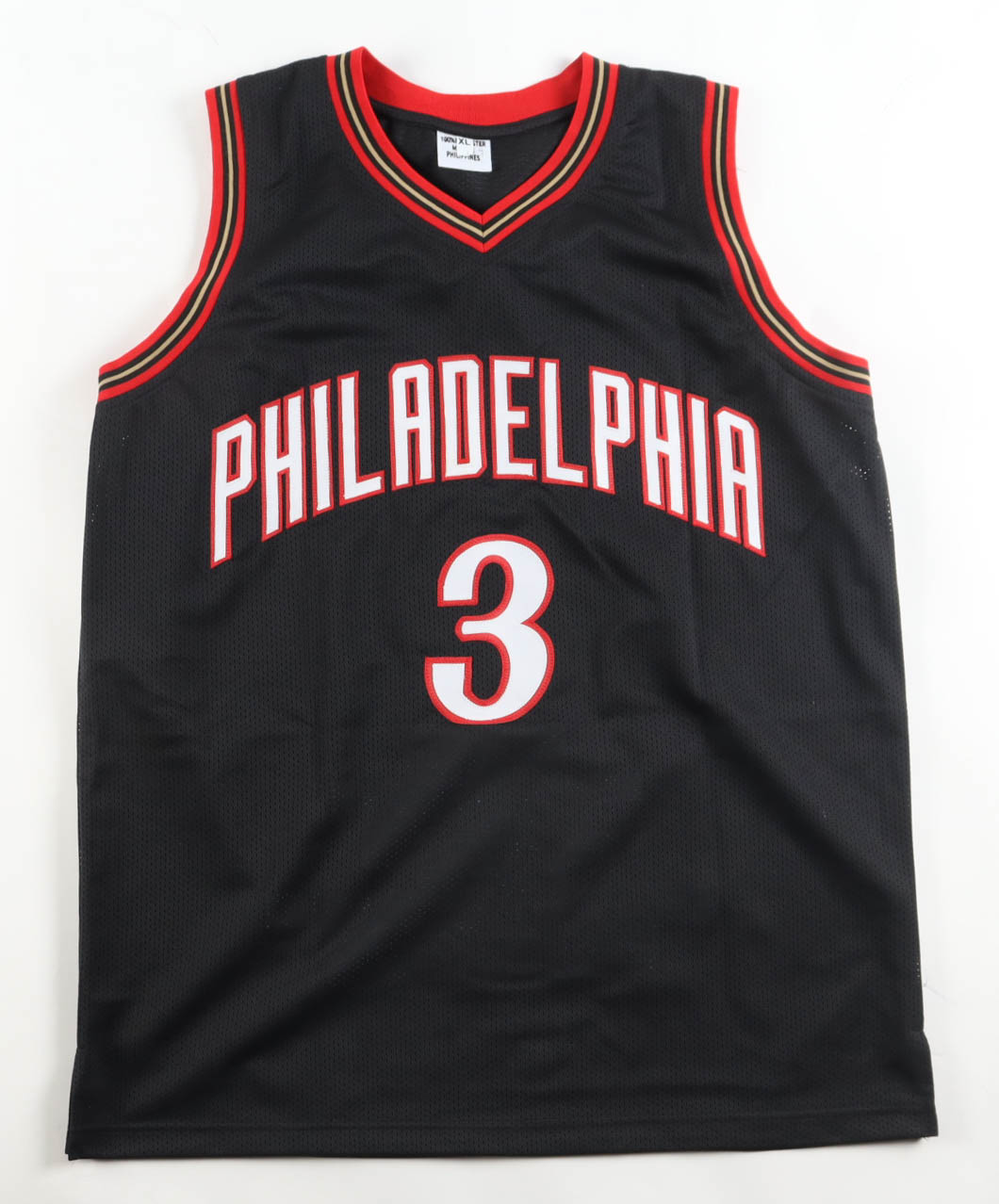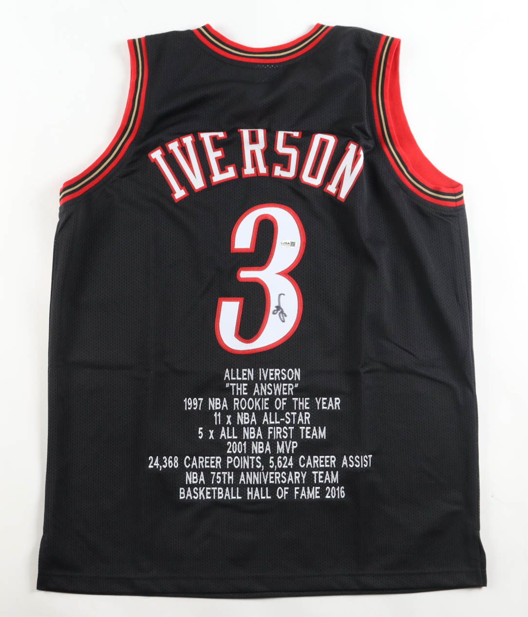 Custom jersey with everything sewn on, size XL. Hand-signed by Allen Iverson (HOF). Iverson's career highlight statistics have been custom-stitched below the reverse numbers.