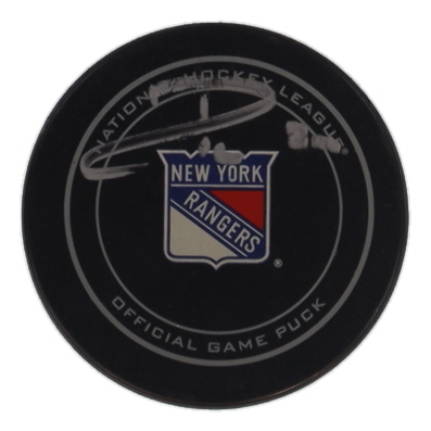 New York Rangers logo hockey puck has been hand-signed by Ryan Callahan.