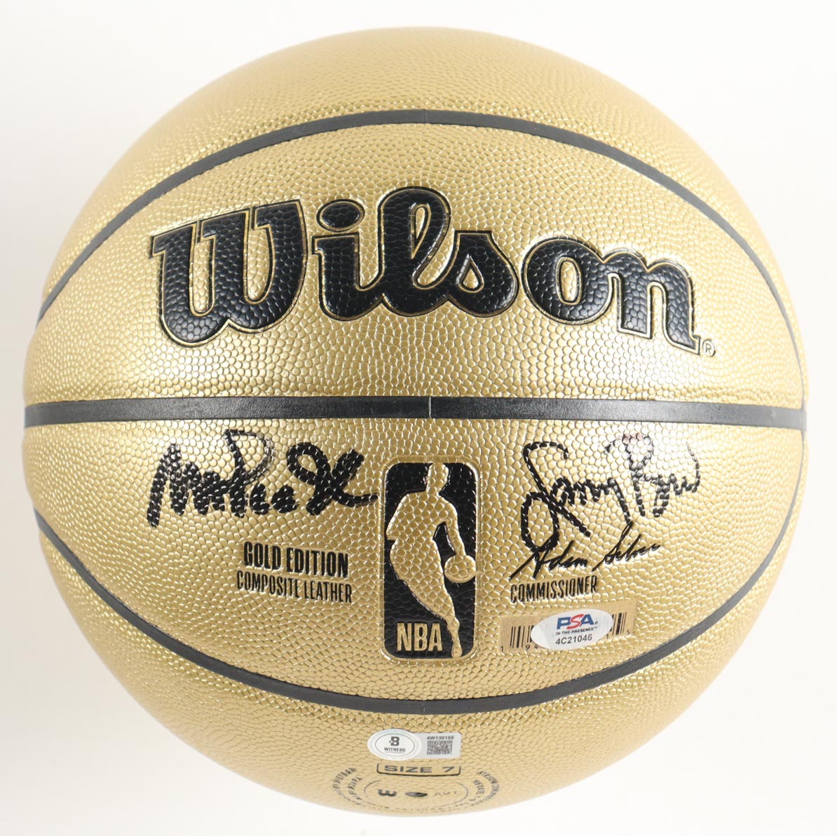 Wilson NBA Indoor/Outdoor Gold basketball has been hand-signed by Magic Johnson (Los Angeles Lakers, HOF) and Larry Bird (Boston Celtics). Note that the display stand is included in the listing as shown above.