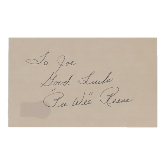 Index card has been hand-signed and inscribed by Pee Wee Reese (D. 1999, Brooklyn Dodgers, HOF). The autograph has been personalized "To Joe."