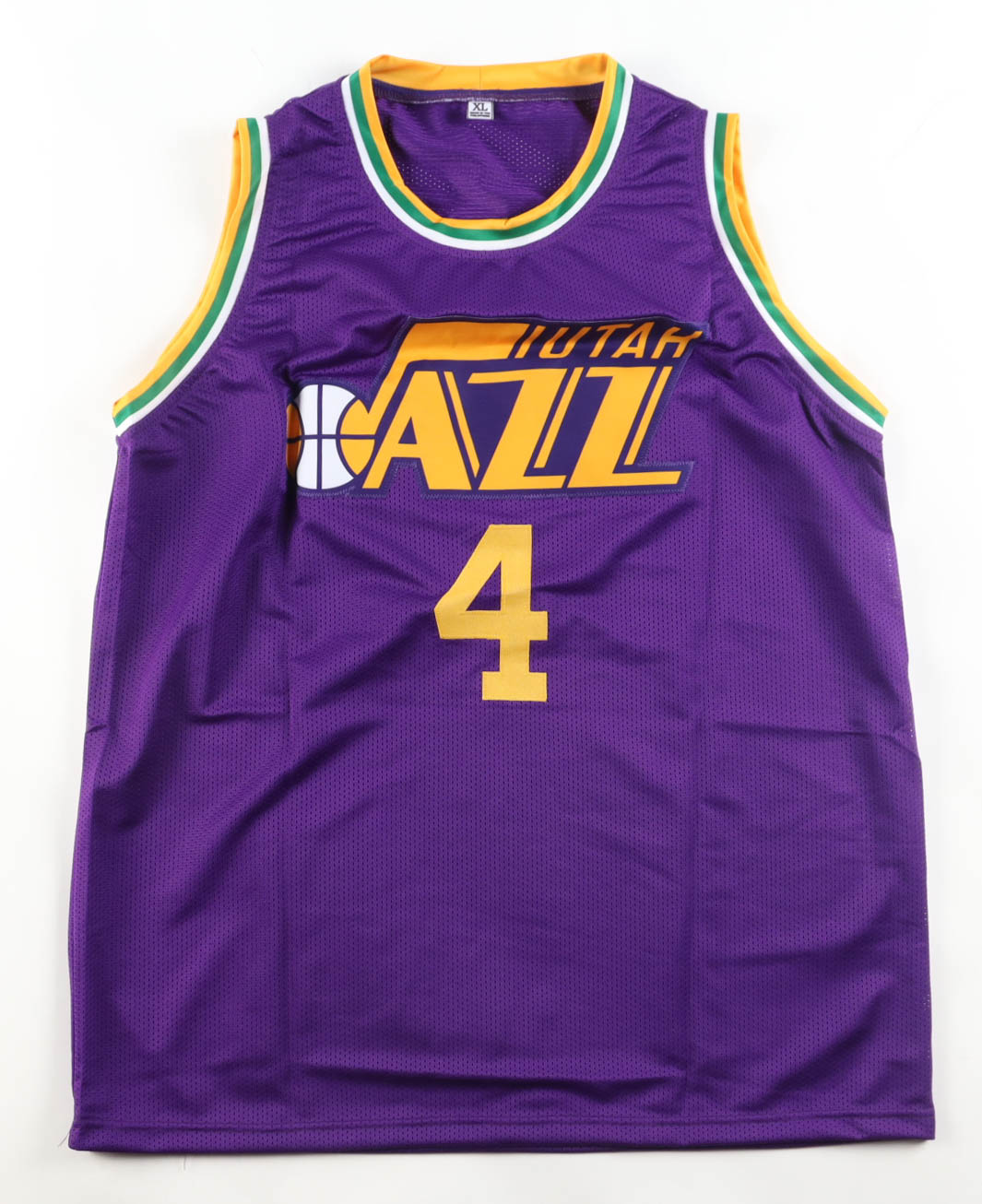 Custom jersey with everything sewn on, size XL. Hand-signed and inscribed by Adrian Dantley (HOF). Please note, glue is visible through the reverse number.
