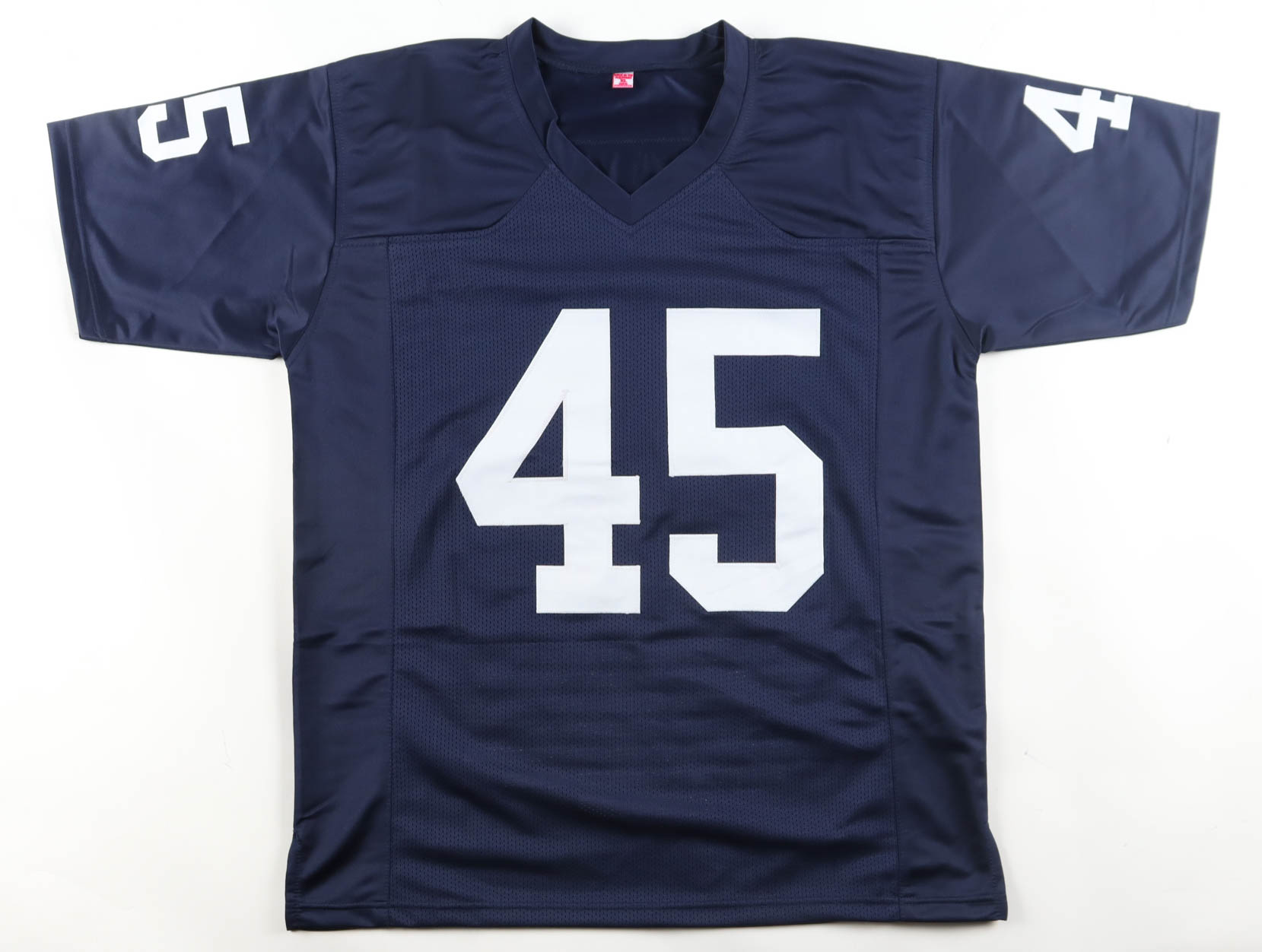 Custom jersey with everything sewn on, size XL. Hand-signed by Rudy Ruettiger. Ruettiger's career highlight statistics have been custom-stitched below the reverse numbers.