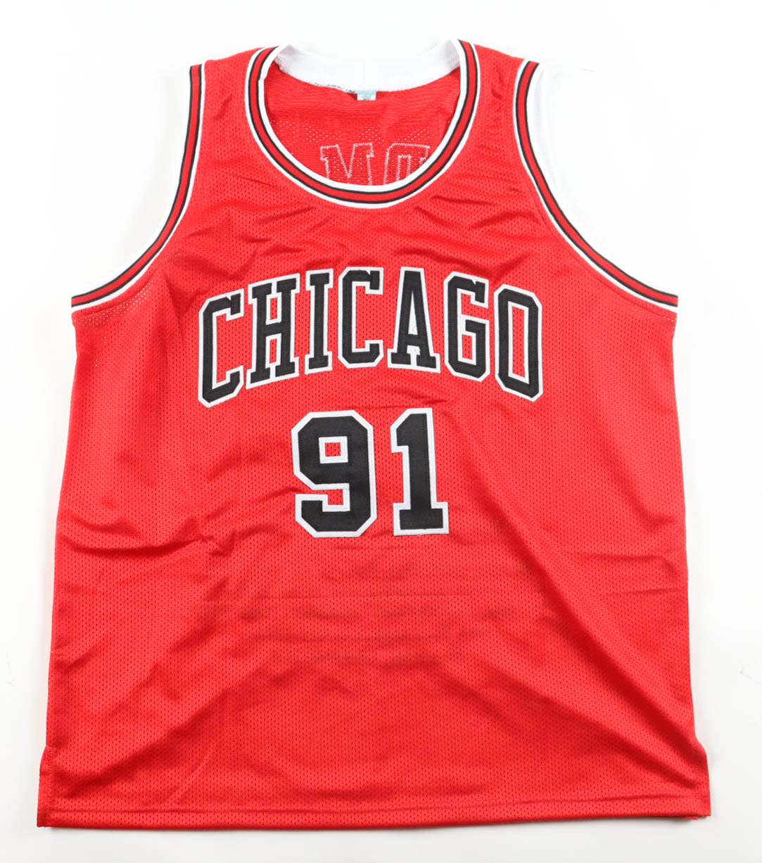 Custom jersey. Everything sewn on, size XL. Hand-signed by Dennis Rodman (Chicago Bulls, HOF). Rodman's career highlight statistics have been custom-stitched below the reverse numbers.