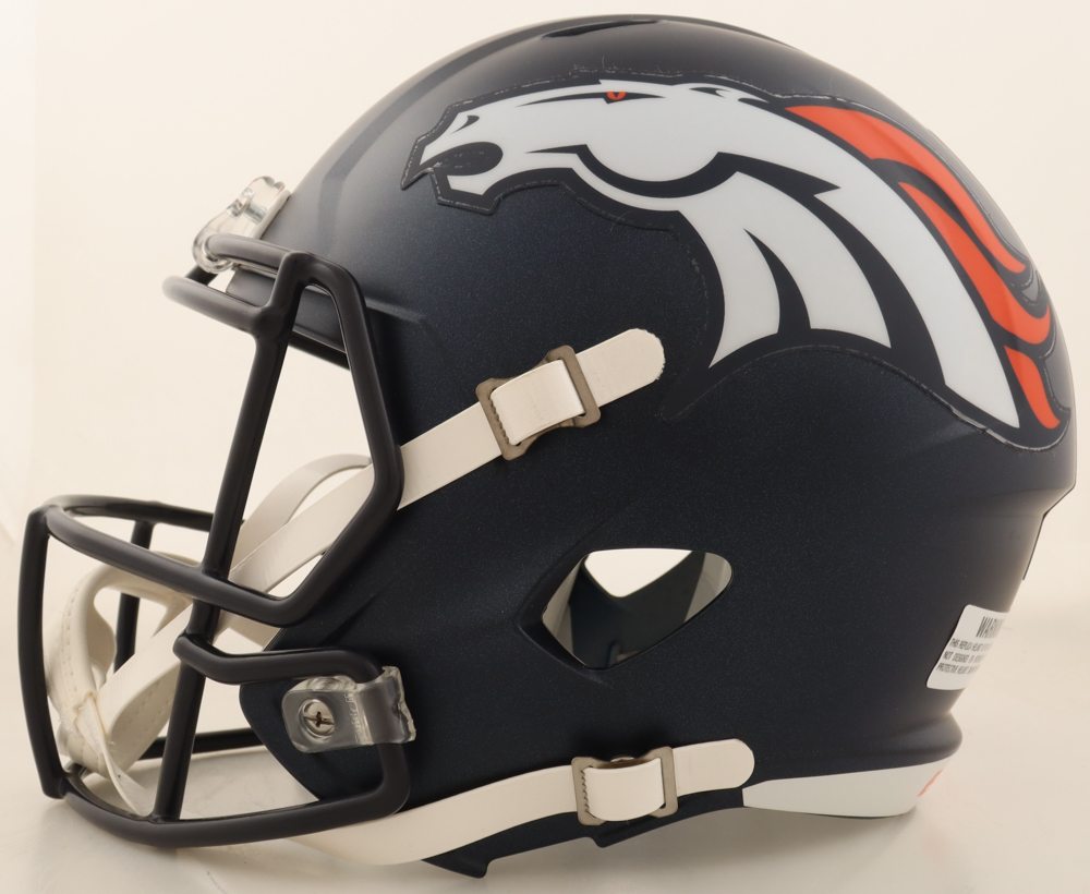 Riddell Denver Broncos full-size speed replica helmet. Hand-signed and inscribed by Dre Greenlaw.