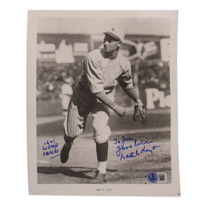 Photo measures 8" x 10" in size. Hand-signed and inscribed by Waite Hoyt (D. 1984, New York Yankees, HOF). The autograph has been personalized "To Joe."