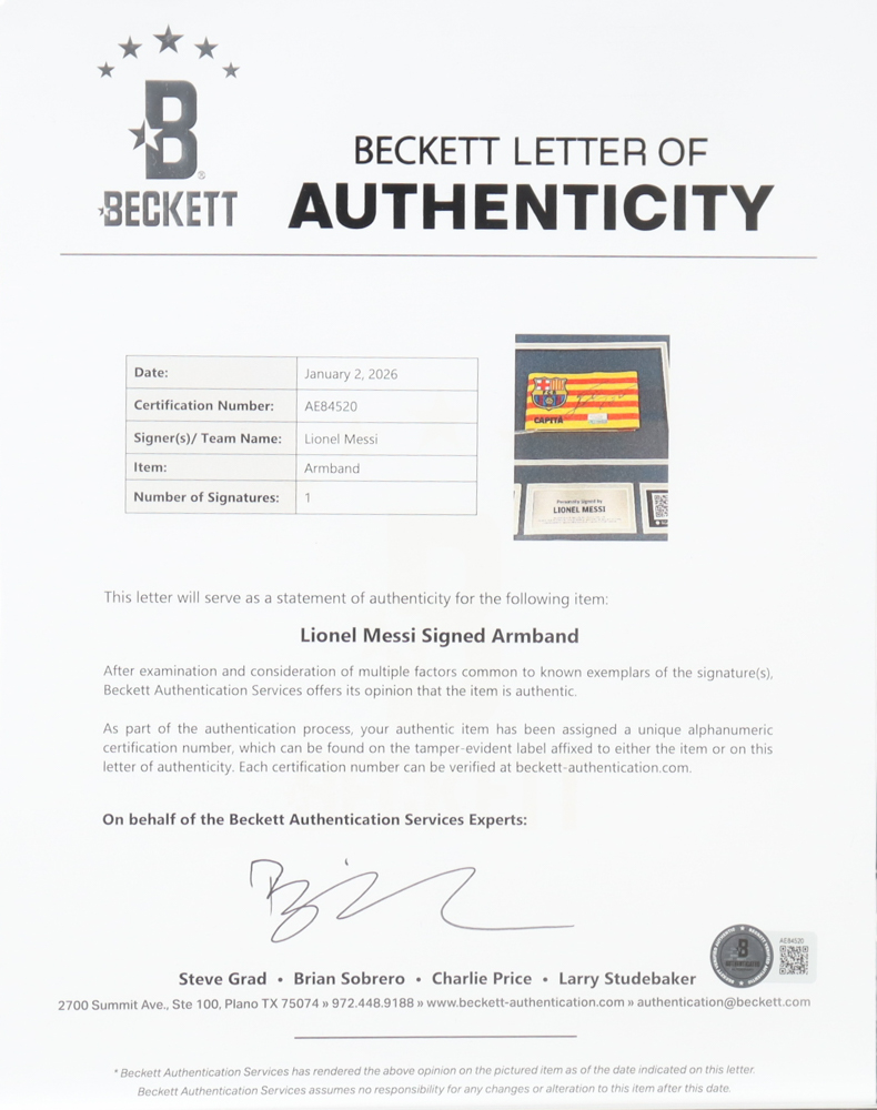 Custom frame measures 18.5" x 23" in size. Features an FC Barcelona armband that has been hand-signed by Lionel Messi.