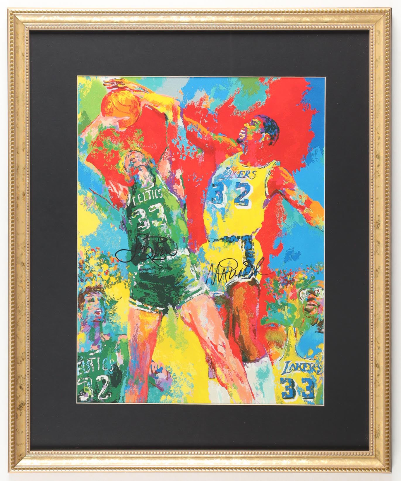 Custom frame measures 19" x 23" in size and features an art print that has been hand-signed by Magic Johnson (Los Angeles Lakers, HOF) and Larry Bird (Boston Celtics, HOF) by Leroy Neiman (D. 2016).