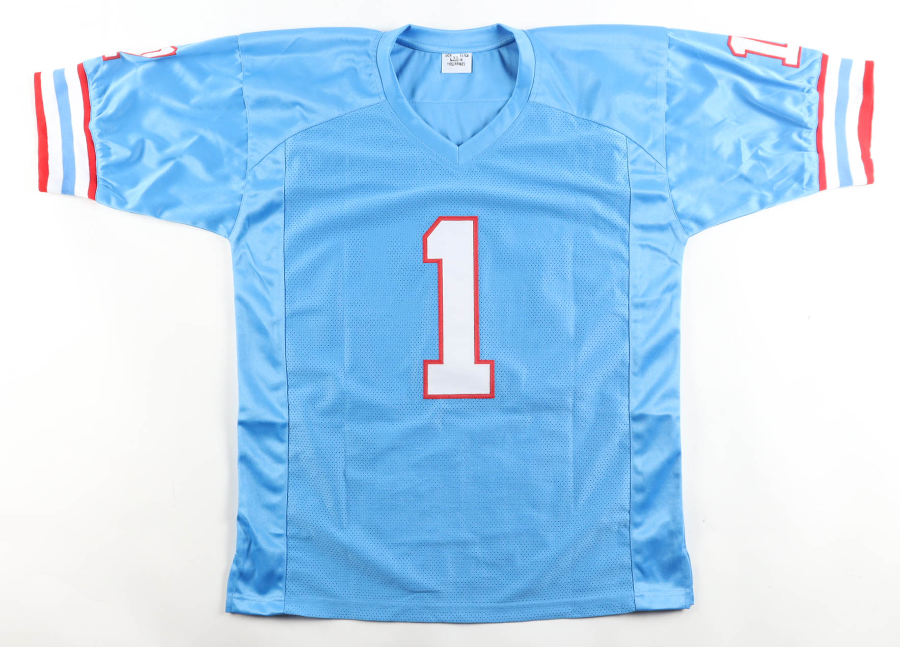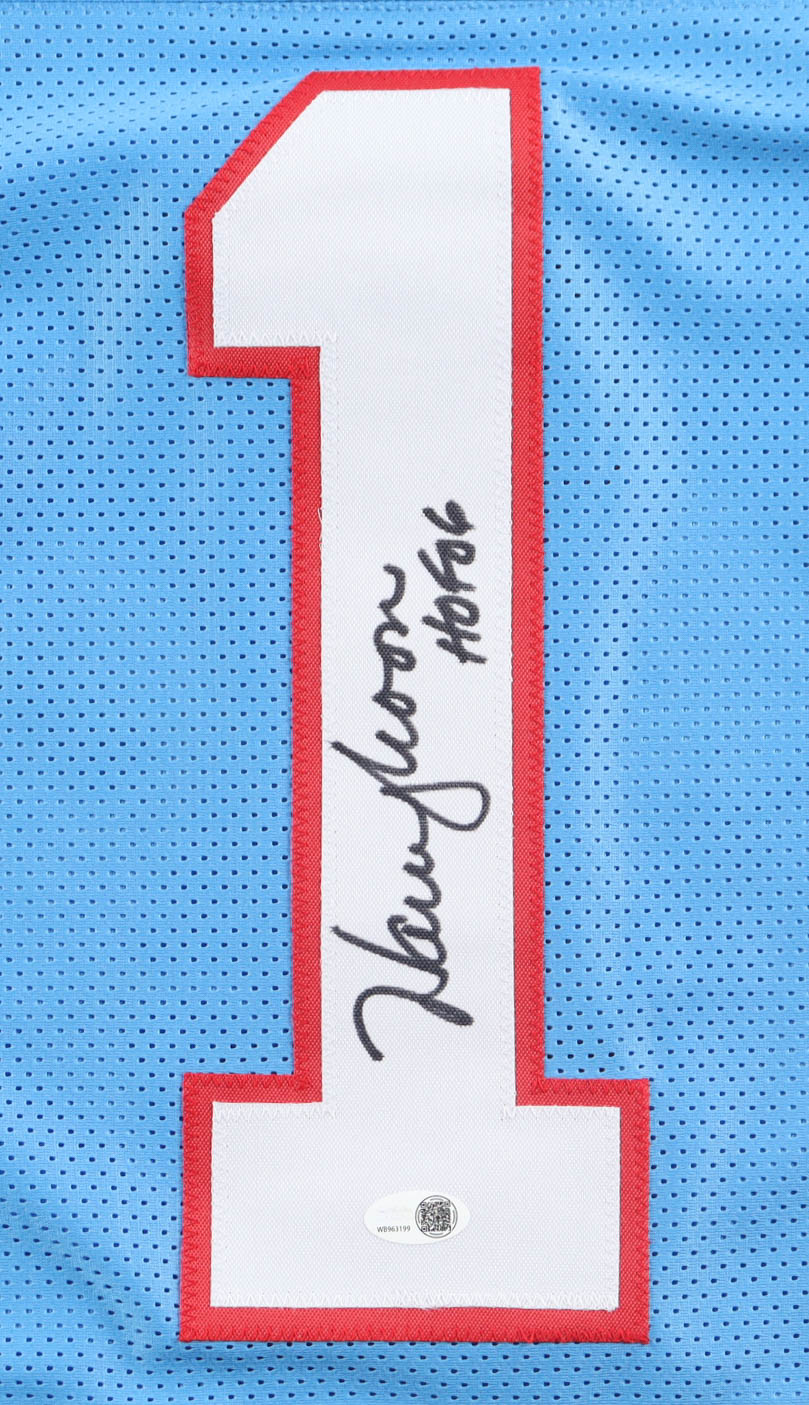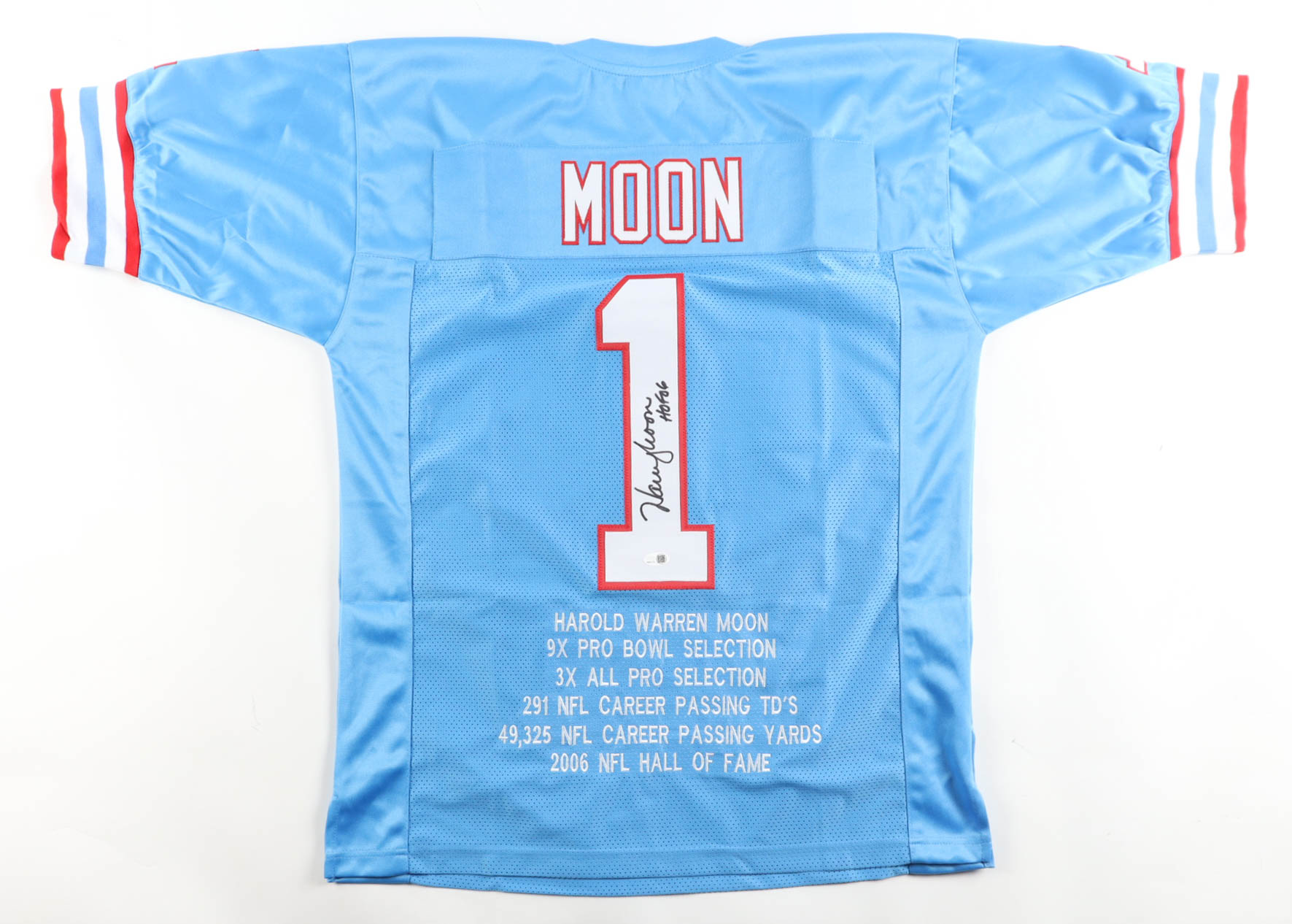 Custom jersey with everything sewn on, size XL. Hand-signed and inscribed by Warren Moon (Houston Oilers, HOF). Moon's career highlight statistics have been custom-stitched below the reverse number.