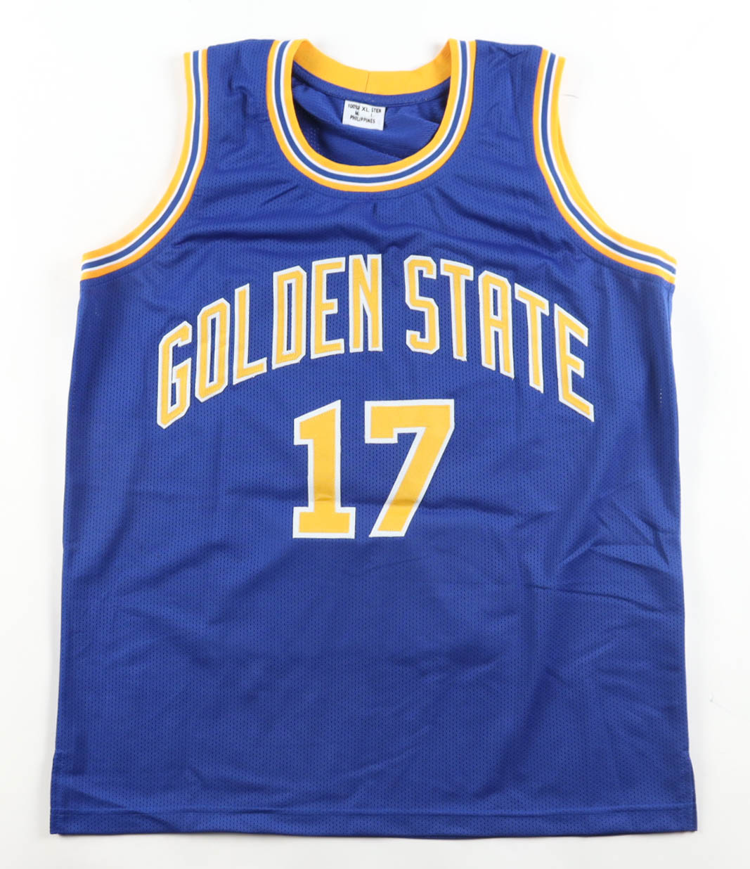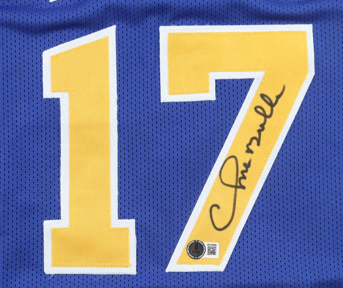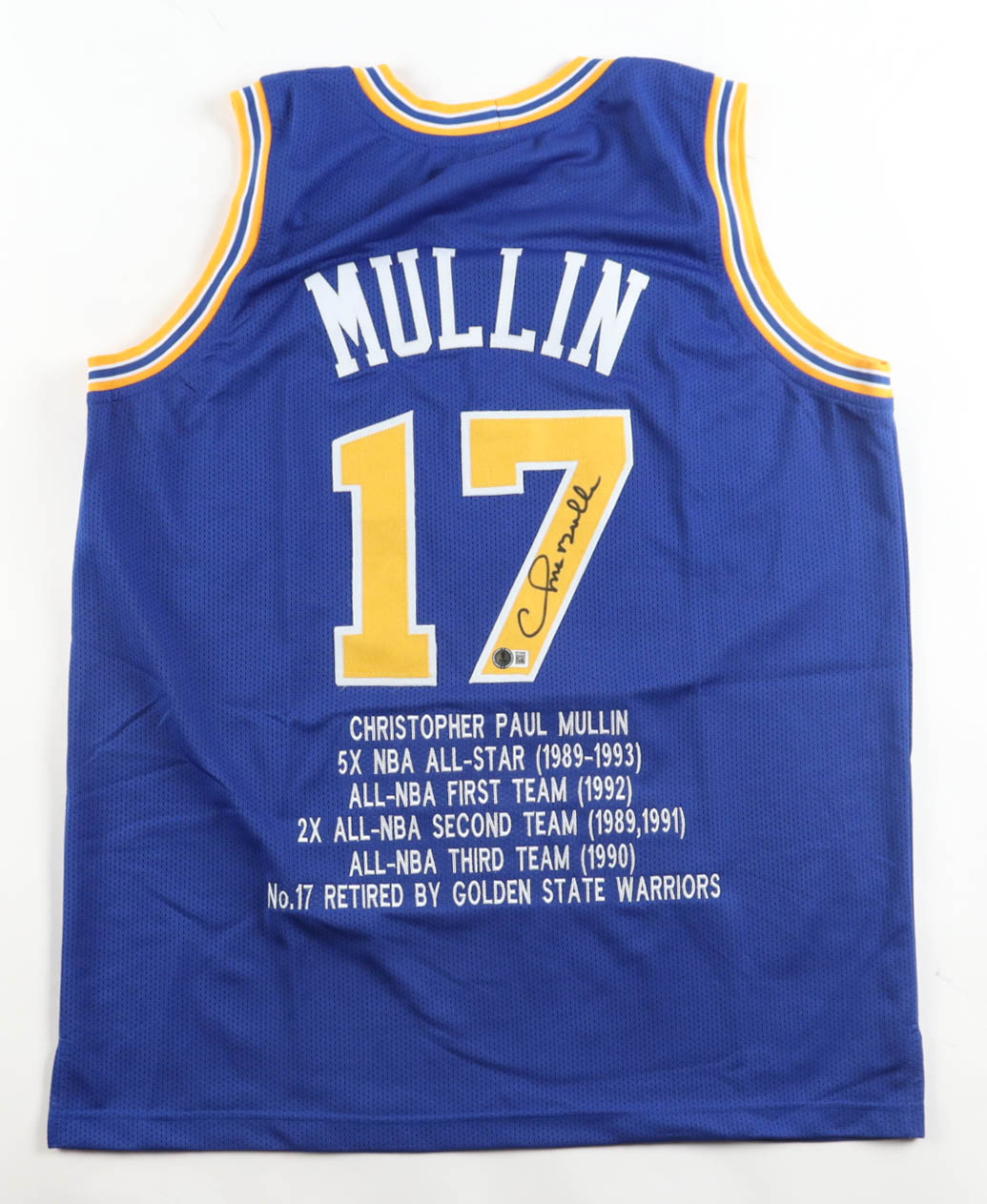 Custom jersey with everything sewn on, size XL. Hand-signed by Chris Mullin (Golden State Warriors, HOF). Mullin's career highlight statistics have been custom-stitched below the reverse numbers.