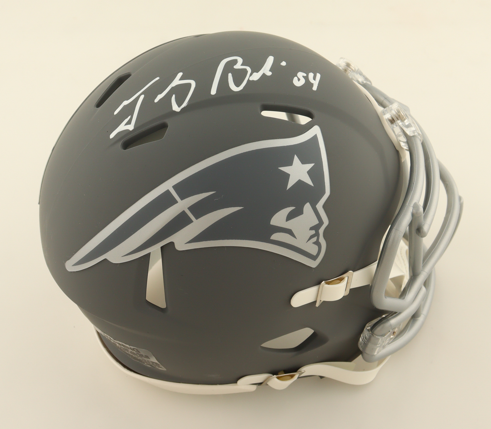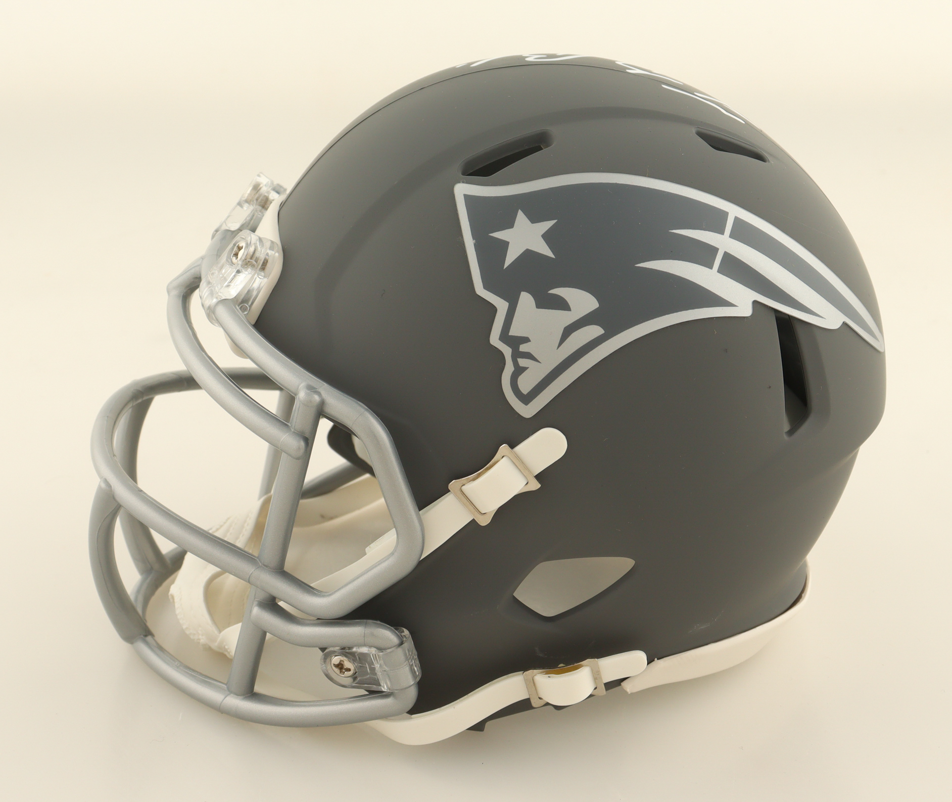 Riddell New England Patriots Slate Alternate speed mini helmet. Hand-signed by Tedy Bruschi.