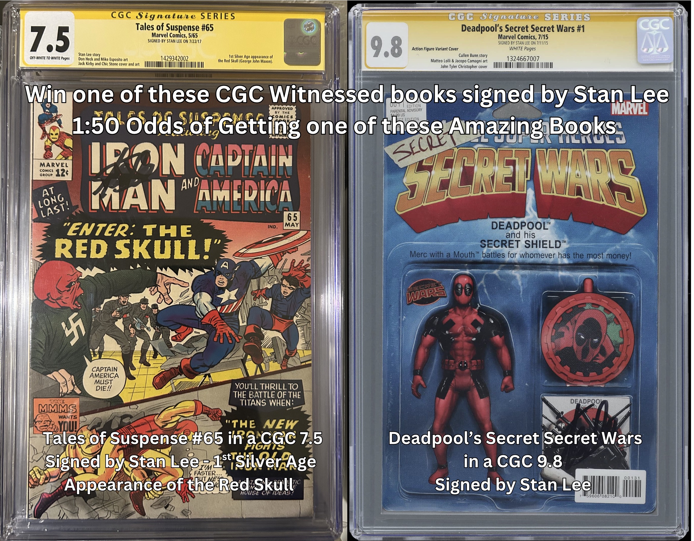 Each “Stan Lee Chase” Mystery Pack includes a guaranteed set of Ten Bagged and Boarded Comic Books, with a chance to win a Tales of Suspense #65 in a CGC 7.5 Signed by Stan Lee - 1st Silver Age Appearance of the Red Skull or a Deadpool’s Secret Secret Wars in a CGC 9.8 Signed by Stan Lee that’s a 1:50 chance to win a book from Stan “the Man” Lee (died 2018).