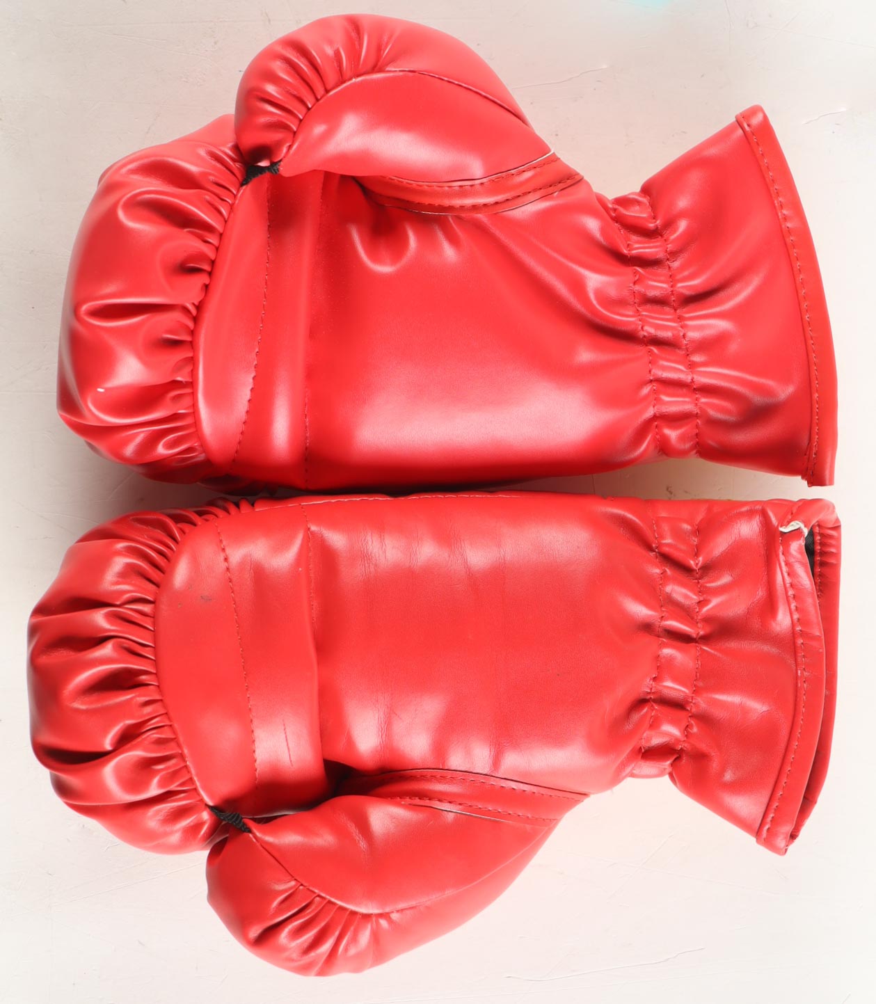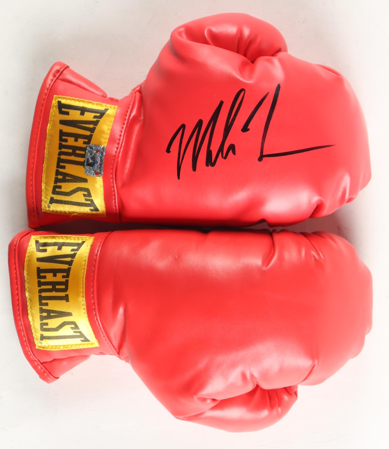 Pair of Everlast boxing gloves. The right-handed glove has been hand-signed by Mike Tyson (HOF). Includes photo back display case as shown in the listing above.