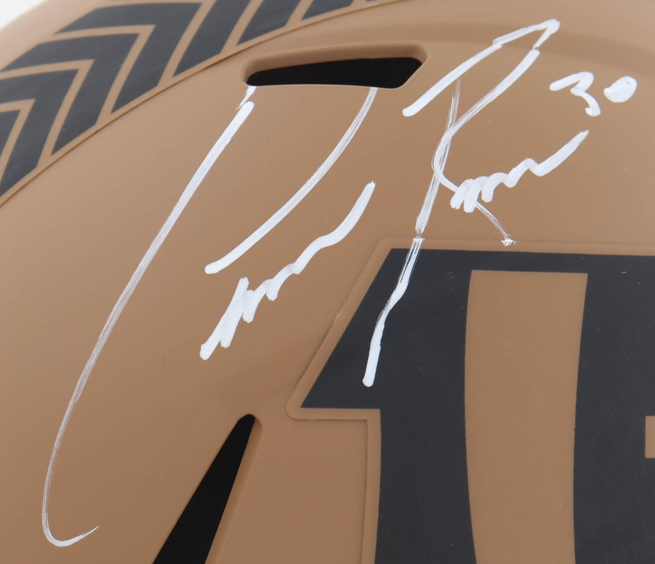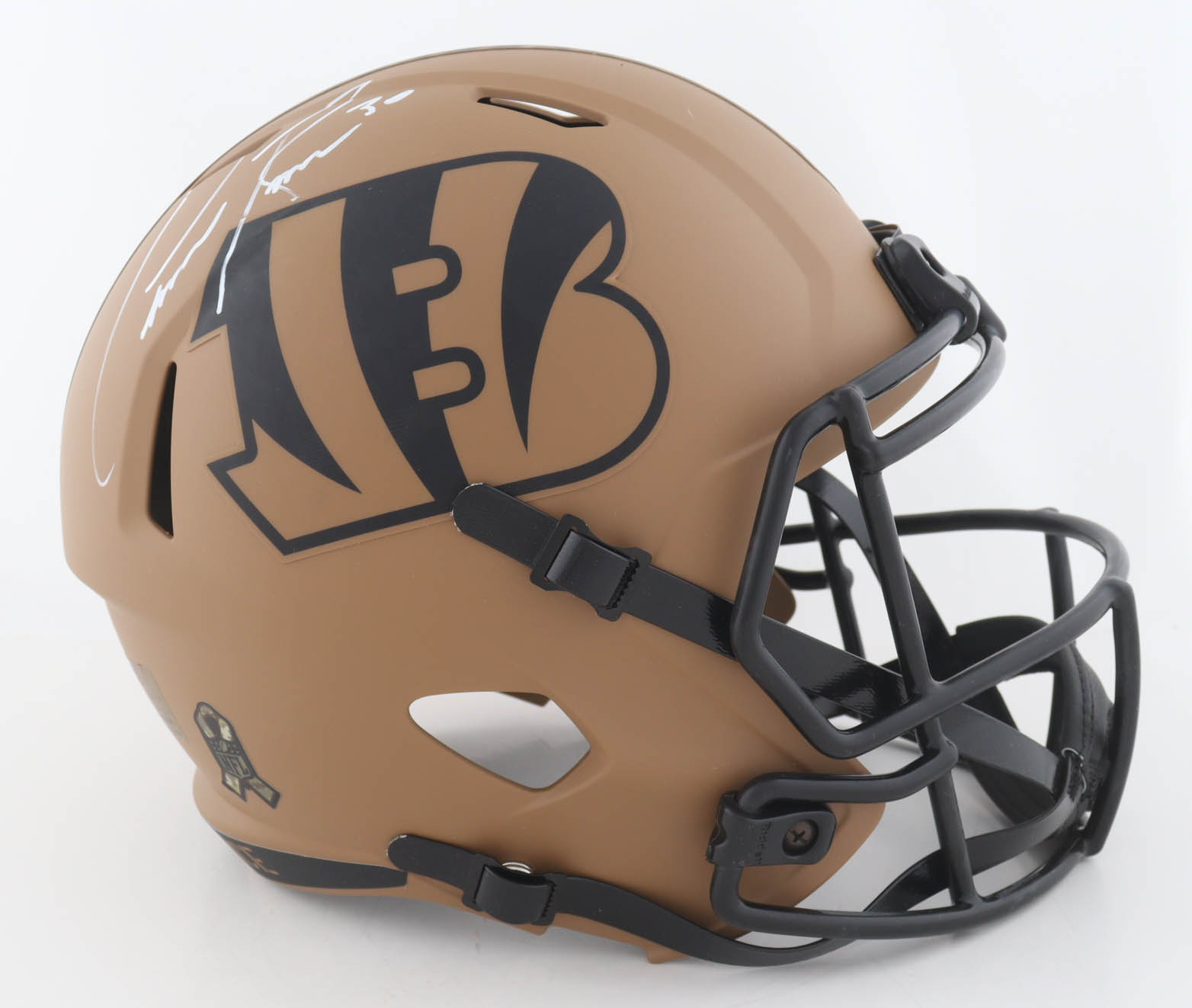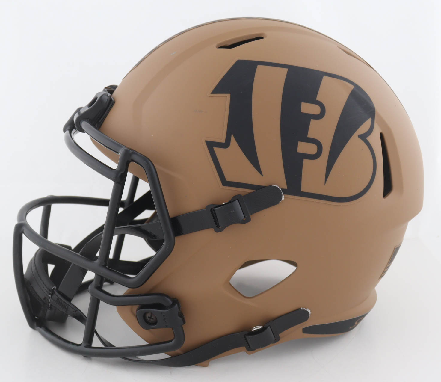 Riddell Cincinnati Bengals Full-Size Salute to Service alternate speed replica helmet. Hand-signed by Chase Brown. Please note, signature has been scuffed. Refer to photos regarding the condition of the item.