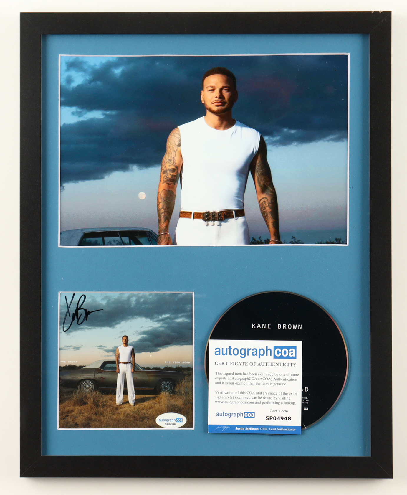 Custom frame measures approximately 12" x 15" in size. Features a "The High Road" CD insert that has been hand-signed by Kane Brown and includes the disc as shown. Please note, there is scuffing throughout the frame.