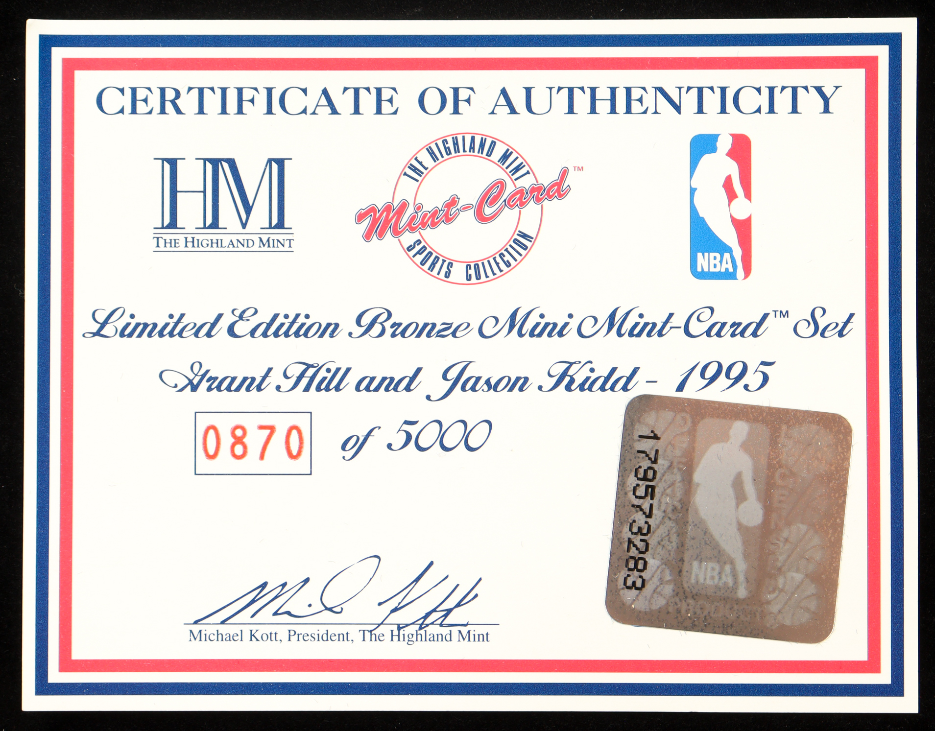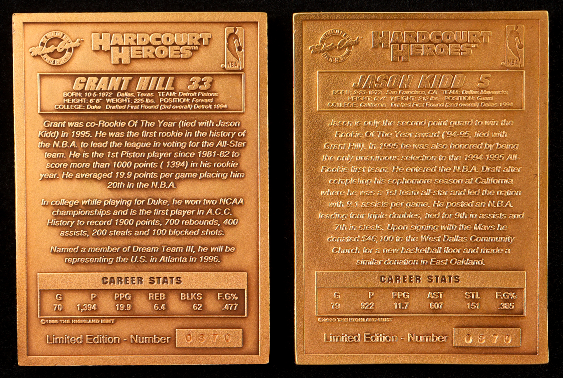 1995 Hardcourt Heroes The Highland Mint bronze mini cards featuring Grant Hill (Detroit Pistons) and Jason Kidd (Dallas Mavericks). This coin is Limited Edition and has been numbered #870/5,000. Please see photos for more details on the condition of the cards.