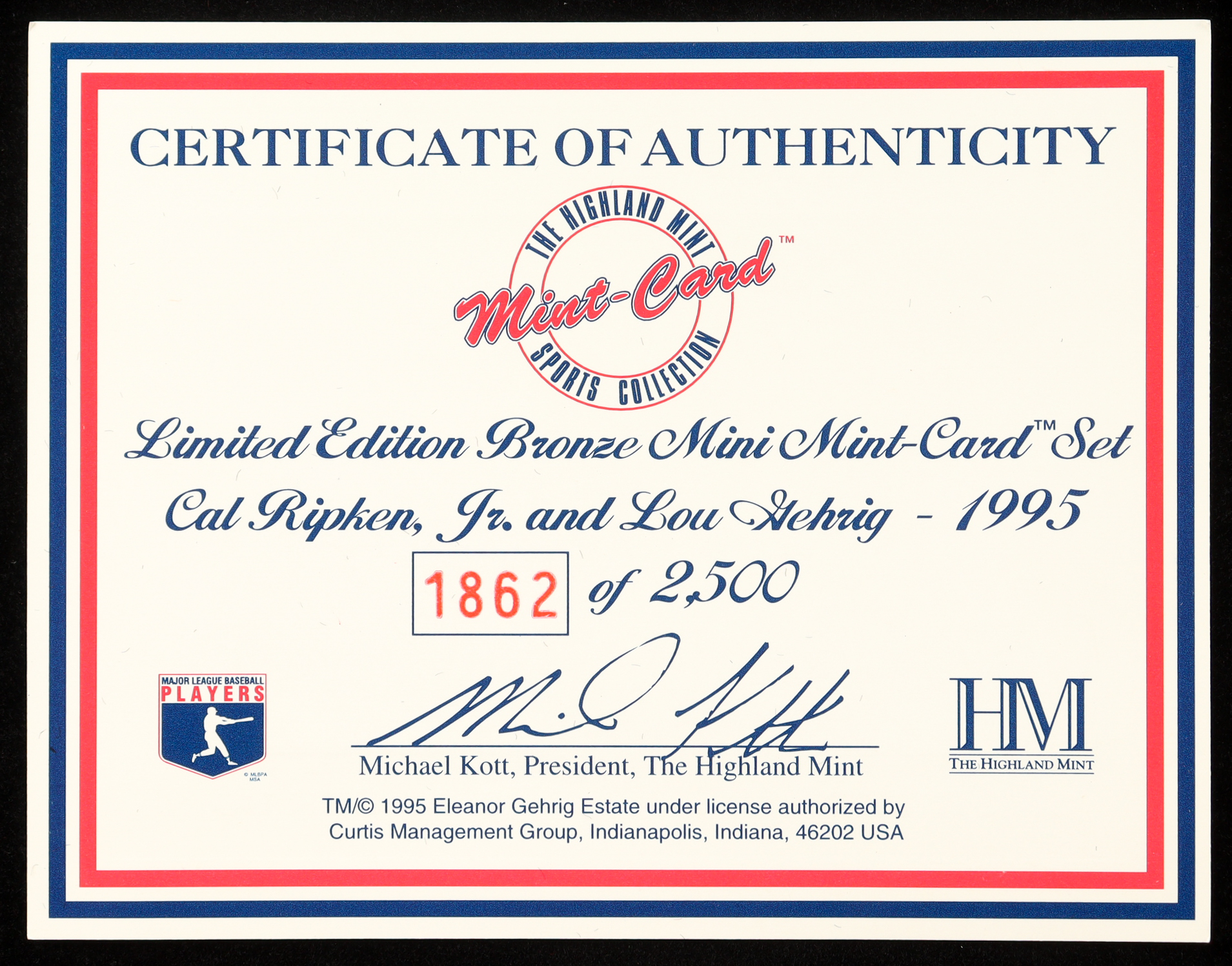 1995 Baseball Legends The Highland Mint bronze mini cards featuring Cal Ripken Jr. (Baltimore Orioles) & Lou Gehrig (New York Yankees). This coin is Limited Edition and has been numbered #1,862/2,500. Please see photos for more details on the condition of the cards.